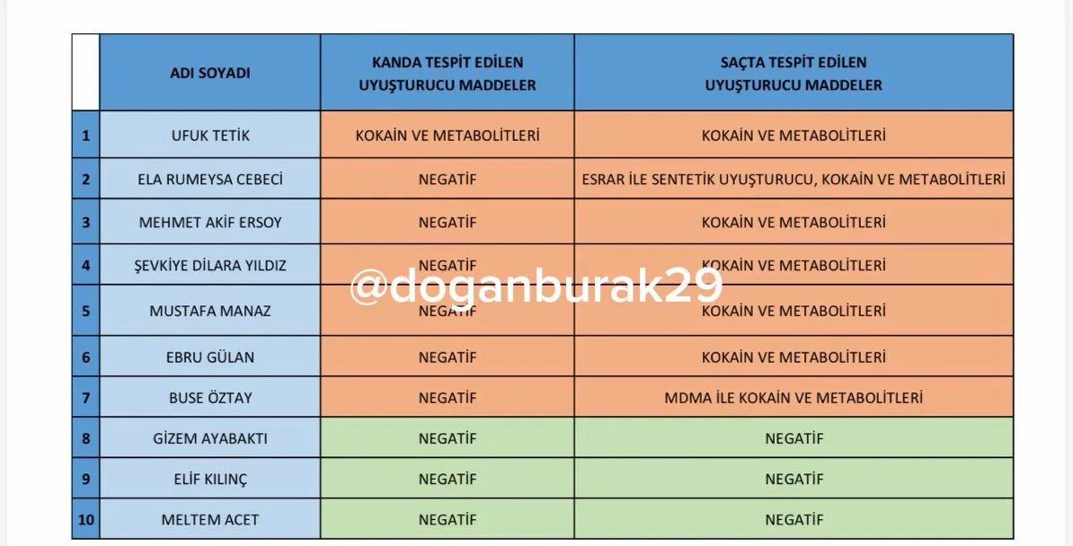 Habertürk eski Genel Yayın Yönetmeni Mehmet Akif Ersoy ve spiker Ela Rümeysa Cebeci'nin de aralarında olduğu 7 kişinin test sonucu pozitif çıkarken Gizem Ayabaktı, Meltem Acet ve Elif Kılınç'ın saç ve kan testlerinde uyuşturucu bulunamadı.