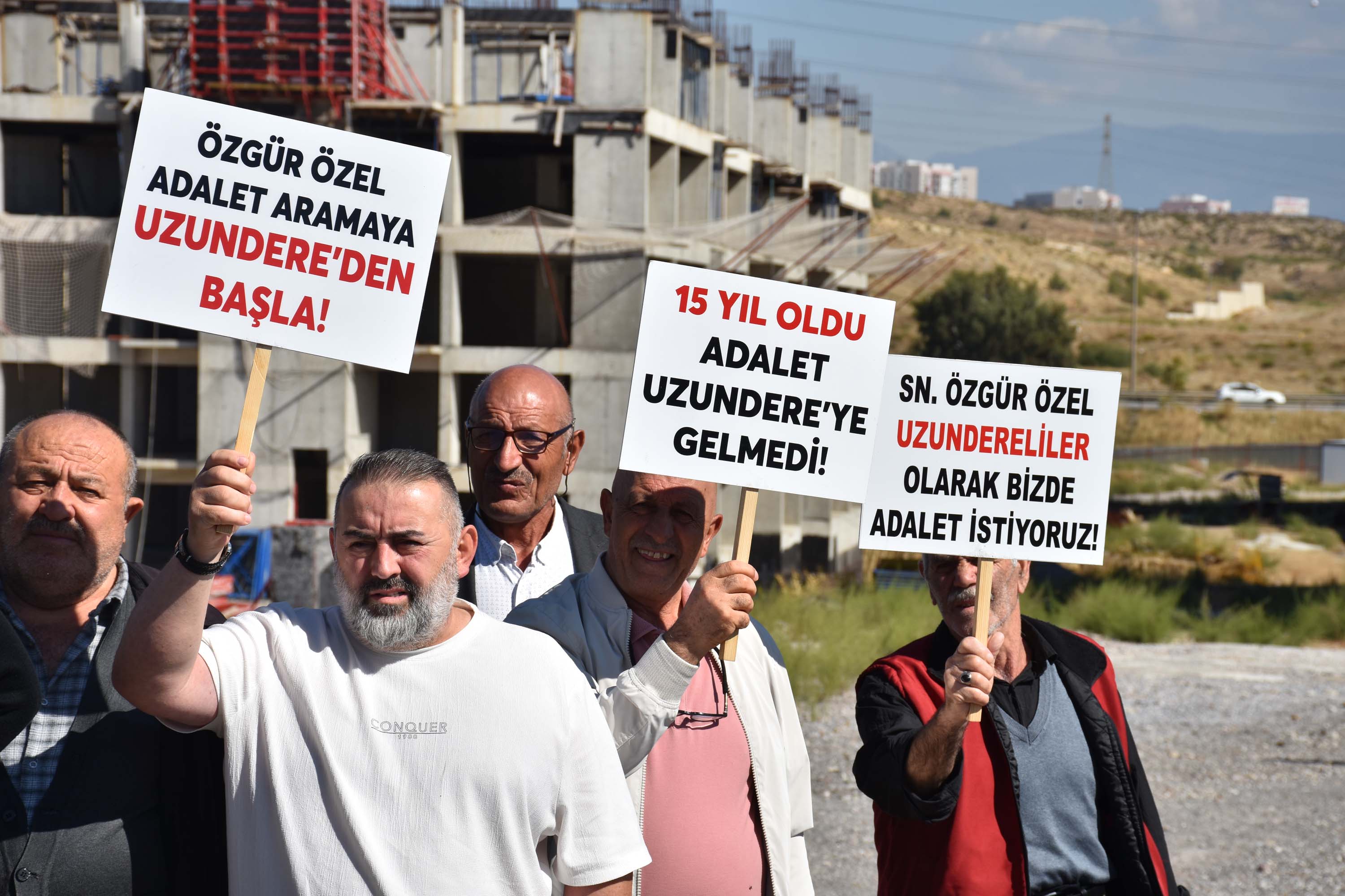 İzmir Büyükşehir Belediyesi iştiraki İZBETON'a yönelik soruşturmada kooperatiflerdeki usulsüzlük iddialarıyla ilgili açılan, eski Büyükşehir Belediye Başkanı Tunç Soyer ve CHP İl Başkanı Şenol Aslanoğlu'nun da aralarında bulunduğu 11'i tutuklu 65 kişinin yargılandığı dava süreci devam ederken, İzmir Büyükşehir Belediyesi'nin Karabağlar Uzundere Mahallesi'ndeki 32 hektarlık alanda yürüttüğü kentsel dönüşüm çalışmaları kapsamında, 15 yıldır kentsel dönüşüm beklediklerini belirten hak sahipleri bir araya geldi. Topluluk, 'Özgür Özel, adalet aramaya Uzundere'den başla', '15 yıl oldu adalet Uzundere'ye gelmedi', 'Büyükşehir'e güvendik rezil olduk', 'Kendinize değil vatandaşa hizmet edin' yazılı dövizler taşıdı.