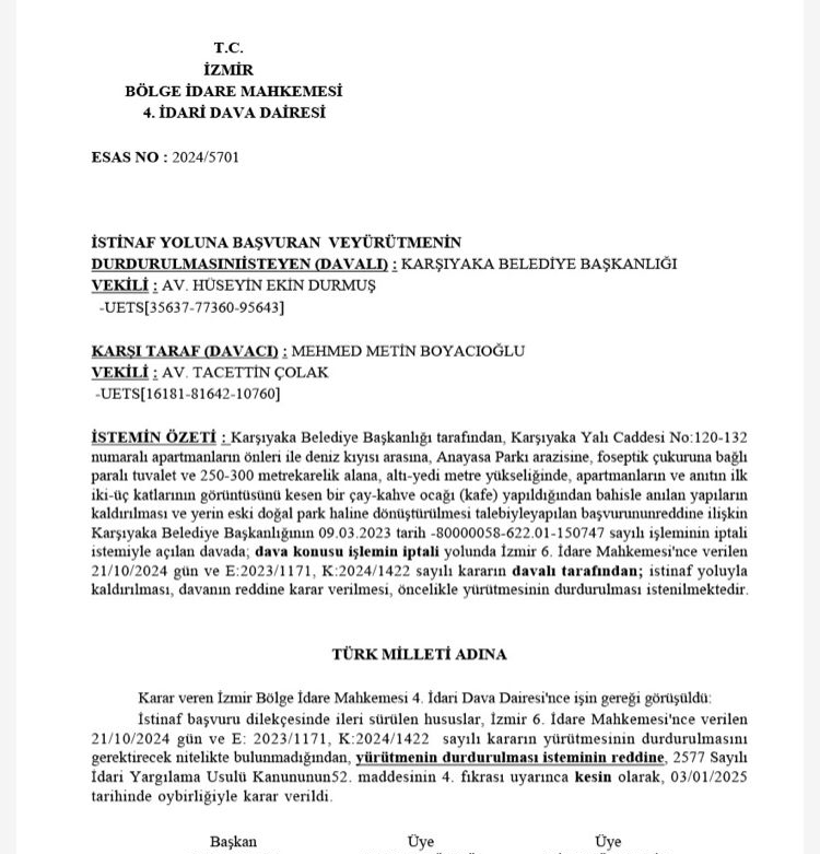 Kesinleşen Ret Kararı (03.01.2025): Karşıyaka Belediyesi’nin yaptığı “Yürütmeyi Durdurma Talebi” başvurusu, İzmir Bölge İdare Mahkemesi 4. İdari Dava Dairesi tarafından "KESİN" olarak reddedildi.