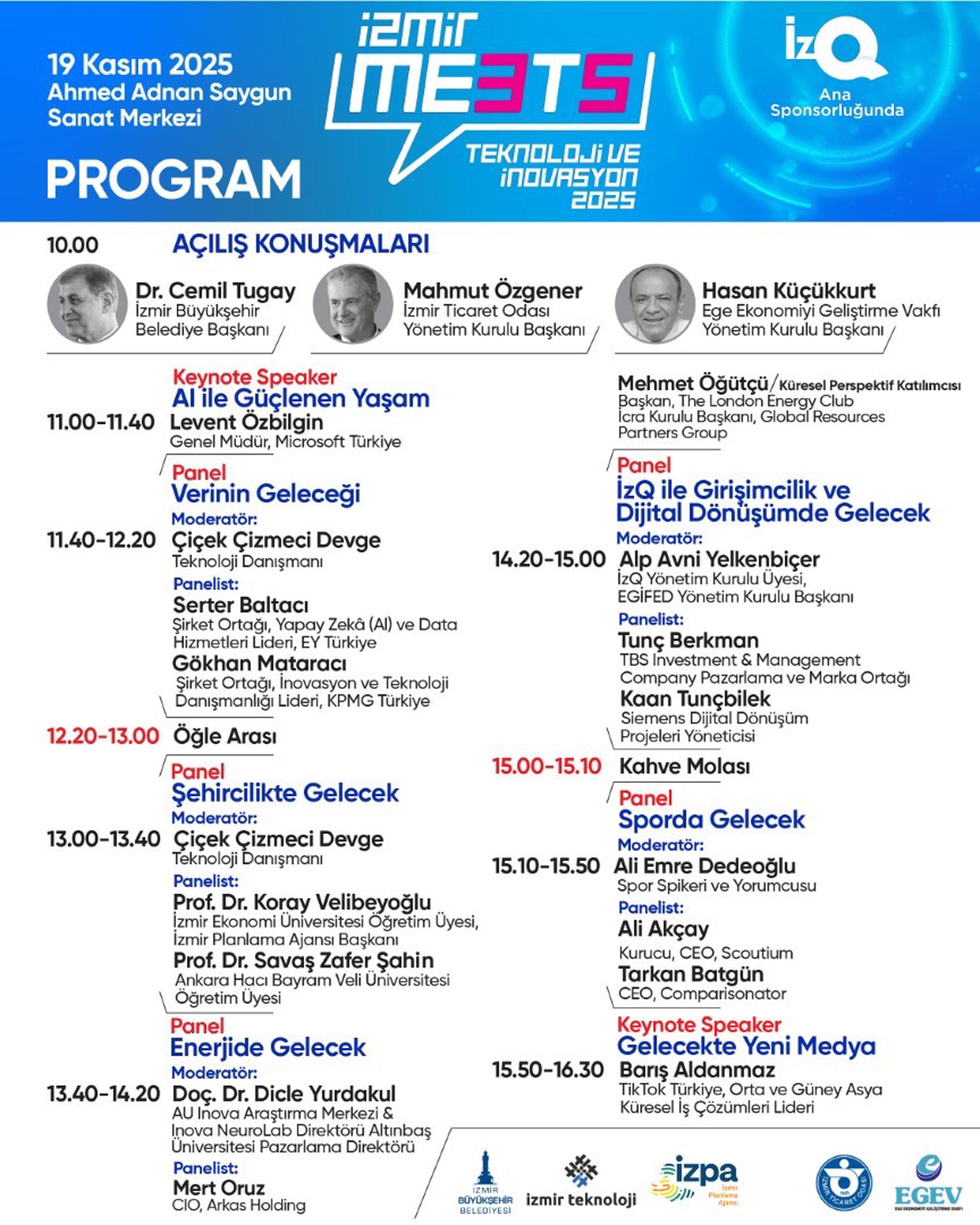 İzmir Büyükşehir Belediyesi, İzmir Ticaret Odası ve Ege Ekonomiyi Geliştirme Vakfı iş birliğiyle ve İzQ İnovasyon ve Girişimcilik Merkezi ana sponsorluğunda 19 Kasım'da Ahmed Adnan Saygun Sanat Merkezi'nde (AASSM) düzenlenecek "Teknoloji ve İnovasyon" temalı "İzmirMeets" in programı belli oldu. Geleceğin dünyasını bugünden şekillendirmek isteyen liderlerin, girişimcilerin ve düşünce önderlerinin katılacağı zirve, İzmir Büyükşehir Belediye Başkanı Dr. Cemil Tugay, İzmir Ticaret Odası Yönetim Kurulu Başkanı Mahmut Özgener ve Ege Ekonomiyi Geliştirme Vakfı (EGEV) Yönetim Kurulu Başkanı Hasan Küçükkurt'un açılış konuşmalarıyla başlayacak. Zirvede, Microsoft Türkiye Genel Müdürü Levent Özbilgin'den TikTok Türkiye Orta ve Güney Asya İş Çözümleri Lideri Barış Aldanmaz'a, EY Türkiye Yapay Zeka (AI) ve Data Hizmetleri Lideri Serter Baltacı ve KPMG Türkiye İnovasyon ve Teknoloji Danışmanlığı Lideri Gökhan Mataracı'dan Arkas Holding CIO'su Mert Oruz, TBS Investment&Management Company Pazarlama ve Marka Ortağı Tunç Berkman, Siemens Dijital Dönüşüm Projeleri Yöneticisi Kaan Tunçbilek, Scoutium Kurucusu ve CEO'su Ali Akçay, Comparisonator CEO'su Tarkan Batgün'e kadar çok sayıda isim İzmirliler ile buluşacak.