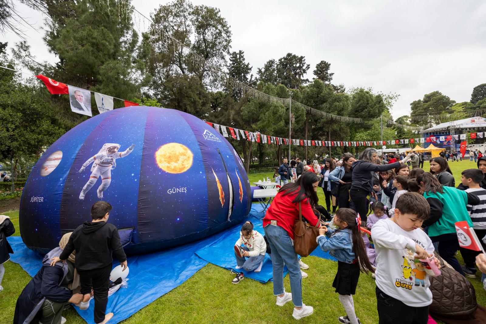 Alan genelinde kurulan planetaryum deneyimi, karnaval oyunları, parkur alanları ve çeşitli oyun grupları çocuklara farklı deneyimler sunarken, aile etkinlik alanında ebeveynler çocuklarıyla birlikte keyifli vakit geçirdi. Gezici Kütüphane, spor deneyim alanı ve uygulama noktaları da gün boyunca yoğun ilgi gördü. Etkinlik alanında oluşturulan çadır bölümünde ise İzmir Büyükşehir Belediyesi birimleri ve sivil toplum kuruluşlarının katkılarıyla 25’ten fazla atölye düzenlendi. Çocuk hakları, sanat, bilim ve doğa temalı atölyelerde çocuklar aktif olarak üretim süreçlerine katıldı. Kültürpark'da devam eden 7. İzmir Kitap Fuarı da kutlamalara katılan çocuklar ve ailelerin duraklarından biri oldu. Gün boyu süren etkinlikler, hem çocuklar hem de aileler için unutulmaz anlara sahne oldu.