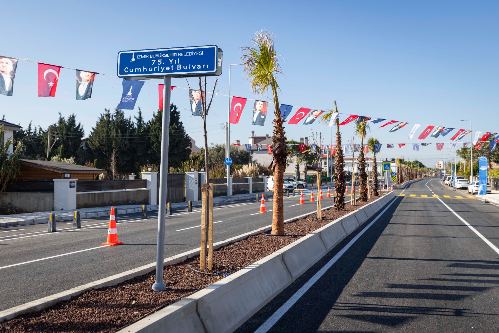 İzmir Büyükşehir Belediyesi tarafından Güzelbahçe’nin hem trafik hem de altyapı sorununu çözecek 75. Yıl Cumhuriyet Bulvarı’nın ilk etabının açılışı yapıldı. Toplamda 4 bin 250 metrelik projenin 1 buçuk kilometrelik etabı, yağmur suyu ve atık su kaynaklı altyapısı, çift şeritli gidiş geliş yolları, bisiklet ve yaya yolları, ilçeye renk katan peyzaj düzenlemeleriyle İzmirlilerin kullanımına açıldı. Fen İşleri Dairesi Başkanlığı ve İZSU Genel Müdürlüğü’nün öncülüğünde, 87 milyon 350 bin liralık dev yatırımla yürütülen projenin açılış törenine İzmir Büyükşehir Belediye Başkanı Dr. Cemil Tugay’ın yanı sıra Güzelbahçe Belediye Başkanı Mustafa Günay, İzmir Büyükşehir Belediyesi CHP Grup Başkan Vekili Altan İnanç, İzmir Büyükşehir Genel Sekreteri Zeki Yıldırım ve Büyükşehir Belediyesi bürokratları, siyasi parti temsilcileri, muhtarlar, meclis üyeleri ve çok sayıda Güzelbahçeli katıldı.