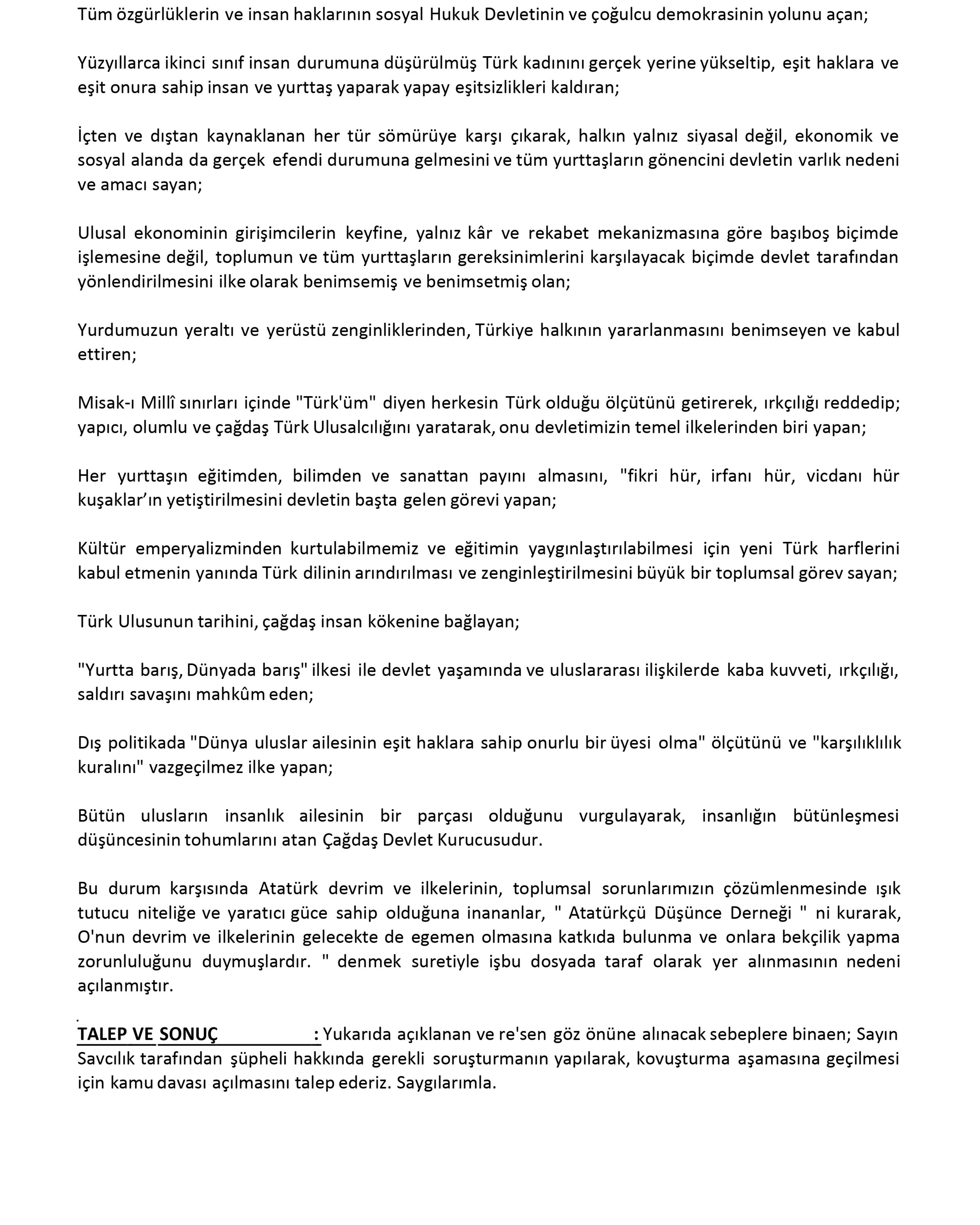 Bu nedenlerle, Atatürkçü Düşünce Derneği olarak AKP’li Milli Eğitim Bakanı Yusuf Tekin hakkında “Anayasayı İhlal” ve “Görevi Kötüye Kullanma” suçları işlediği gerekçesiyle yaptığımız kamu davası açılması talepli suç duyurumuzu basınımızın ve aziz milletimizin bilgi ve ilgisine sunarız."