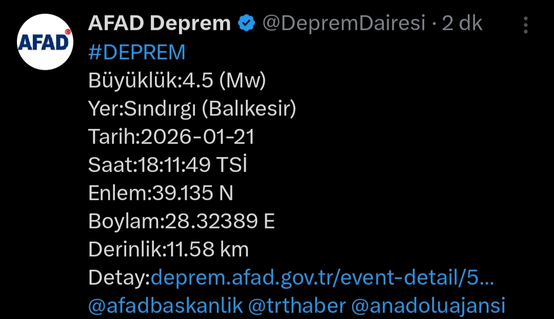 Açıklamada, "Balıkesir ilimizin Sındırgı ilçesinde saat 18.11’de meydana gelen 4.5 büyüklüğündeki deprem sonrası, an itibarıyla, olumsuz bir durum bulunmamaktadır. Saha tarama çalışmaları devam etmektedir. Etkilenen vatandaşlarımıza geçmiş olsun dileklerimizi sunarız." denildi.
