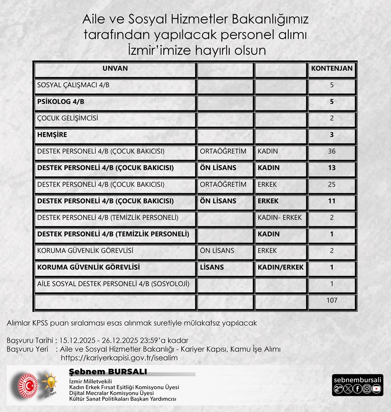 AK Parti İzmir Milletvekili Şebnem Bursalı, Aile ve Sosyal Hizmetler Bakanlığı tarafından yapılacak personel alımına ilişkin yazılı bir açıklama yaptı.