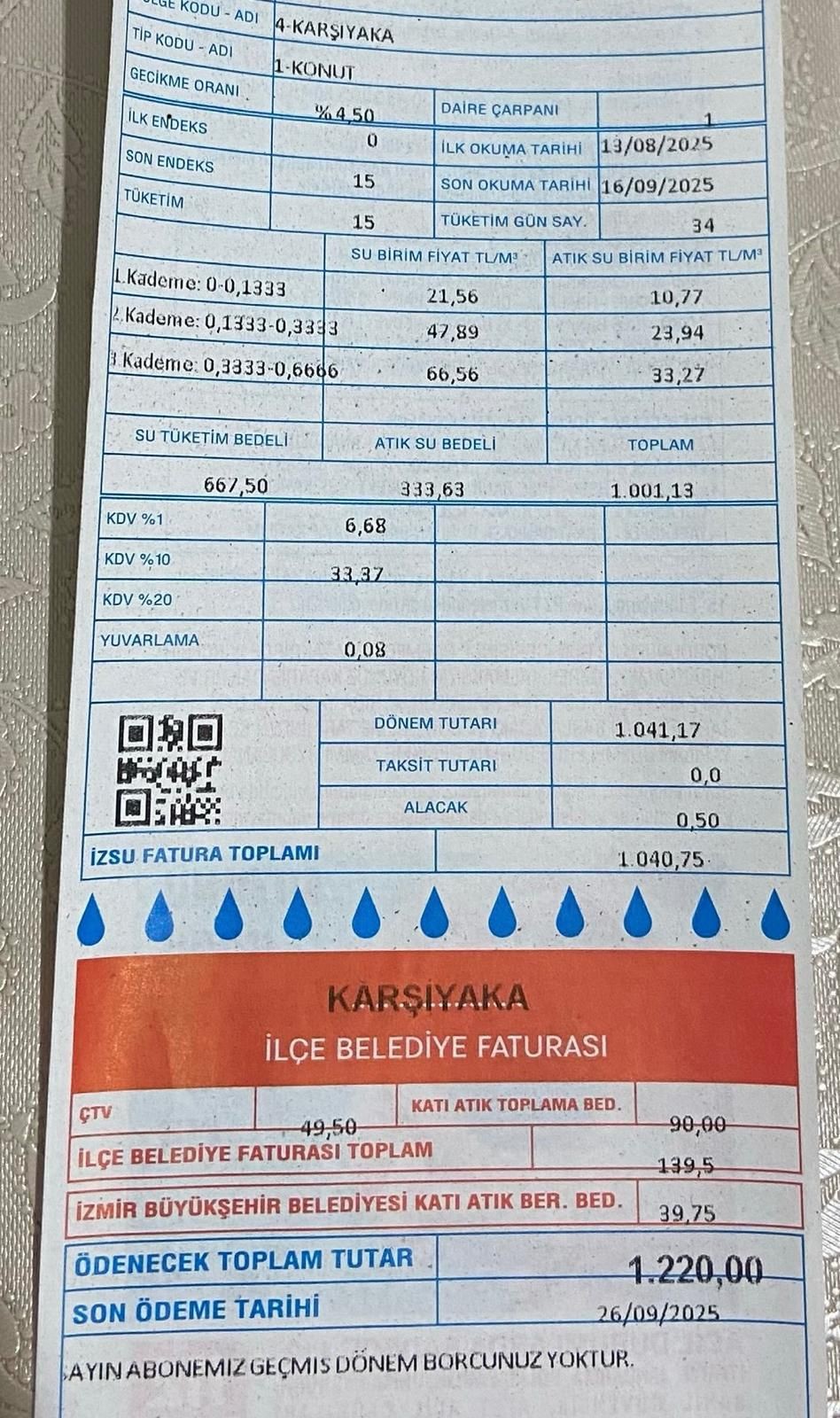 Ünal, örnek olarak vatandaşa gönderilen bir faturayı basına göstererek şunları kaydetti: “İzmirli vatandaşlarımız su faturalarını öderken temizlik hizmeti için ayrı ayrı kalemler altında bedel ödemektedir. Örneğin ekte sunduğumuz faturada görüleceği üzere; Çevre Temizlik Vergisi (ÇTV) olarak 49,50 TL, İlçe Belediyesi Katı Atık Toplama Bedeli olarak 90 TL, ayrıca İzmir Büyükşehir Belediyesi Katı Atık Bertaraf Bedeli olarak 39,75 TL tahsil edilmektedir. Yani vatandaş hem ilçe belediyesine hem de Büyükşehir’e çöp toplama ve bertaraf için parasını peşinen ödemektedir. Ama gelin görün ki, parasını ödediği hizmeti alamamakta, çöpler sokaklarda birikmektedir.”
