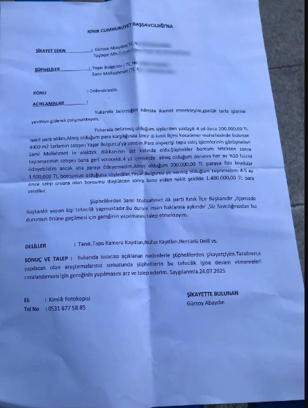 "*İşin bir ara bozuldu. Bana tefe para veren birilerini söylediler, yönlendirdiler. Yönlendiren Sami Mollaahmet Kınık AKP İlçe Başkanı'dır. Ben sana yardımcı olurum bu konuda dedi yani. Para veririm sana verdiririm. Tabii güvendik gittik. Yaşar Bulgurcu isimli şahısla görüştük. Tapu karşılığında ben sana para veririm dedi. İşlerim daha kötüye gitti ödeyemedim. Ödemeyince verdiğim teminat olarak verdiğim tapuyu Yaşar Bulgurcu Sami Mollaahmet ilçe başkanımız benim tarlama müşteri bulmuş. Belki yardımcı oldular ama tarlanın pazarlığını yapmışlar.