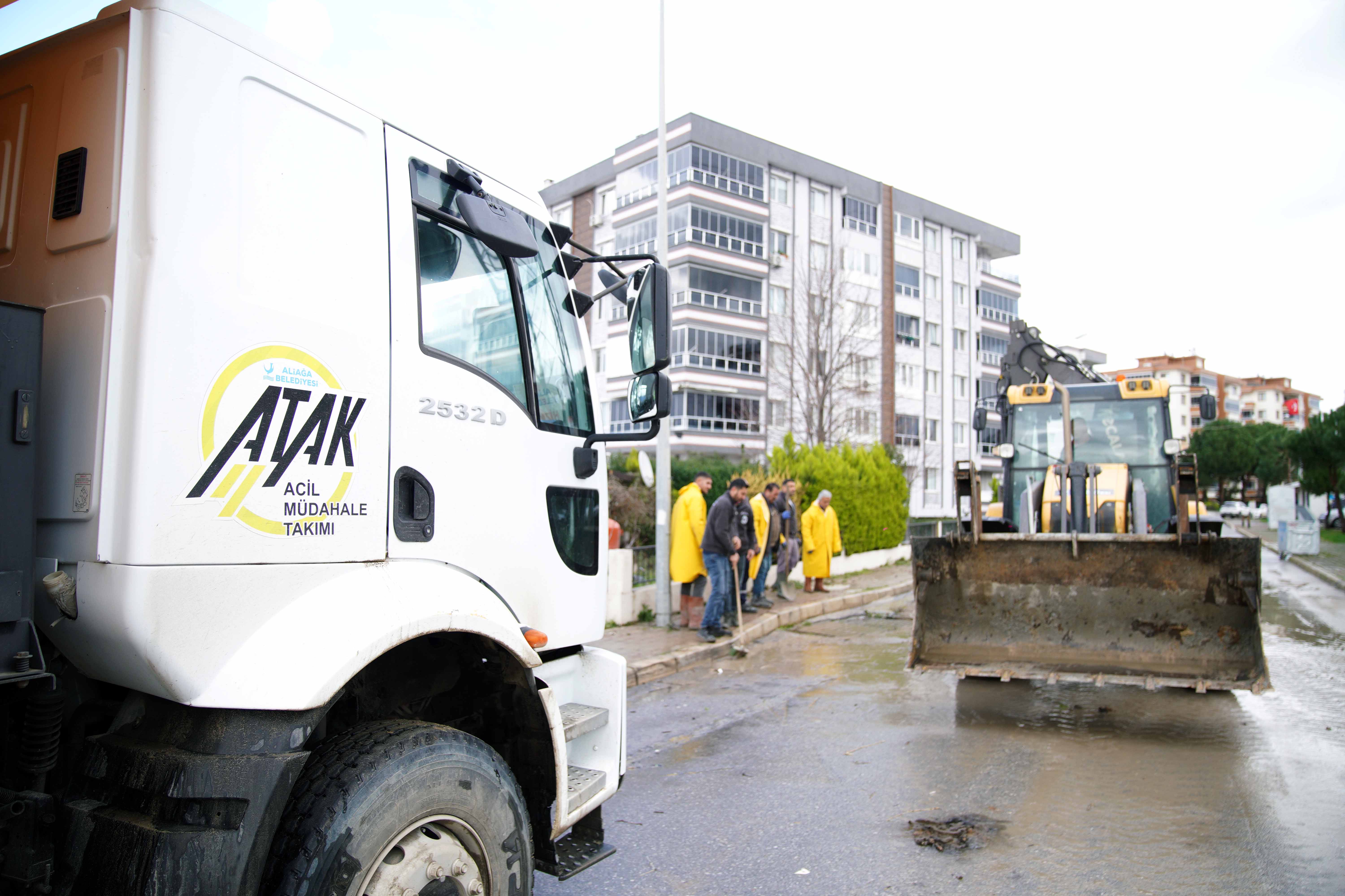 Aliağa Belediyesi’ne bağlı 12 ekip; kepçe, kamyon ve vidanjörlerle ihtiyaç duyulan noktalara kısa sürede ulaşarak müdahalelerde bulundu. Mazgallar açıldı, yol kontrolleri gerçekleştirildi ve giderleri tıkayan büyük parçalar temizlendi.