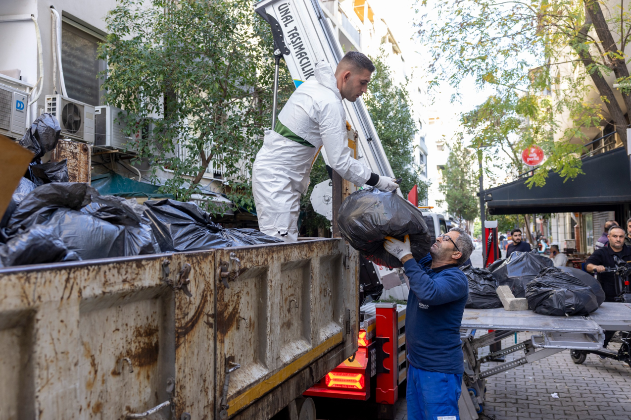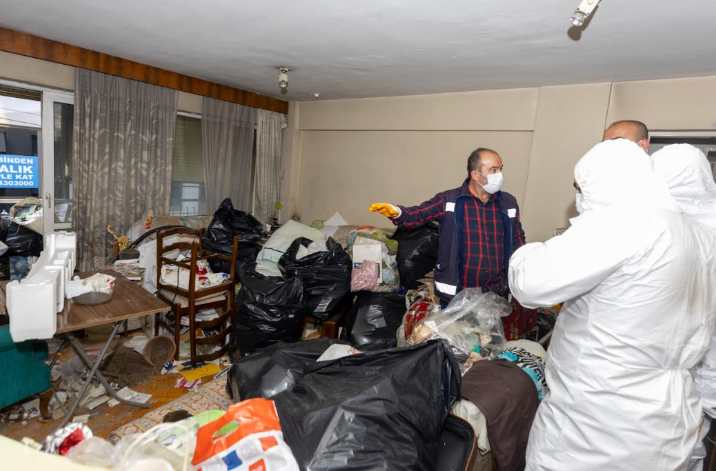 Vatandaşlardan gelen çöp ev ihbarlarını değerlendirerek hızlıca müdahale eden Konak Belediyesi’ne bağlı ekipler, Alsancak’taki bir apartman dairesinden 4 kamyon dolusu yaklaşık 10 ton atık eşya ve çöp çıkardı.