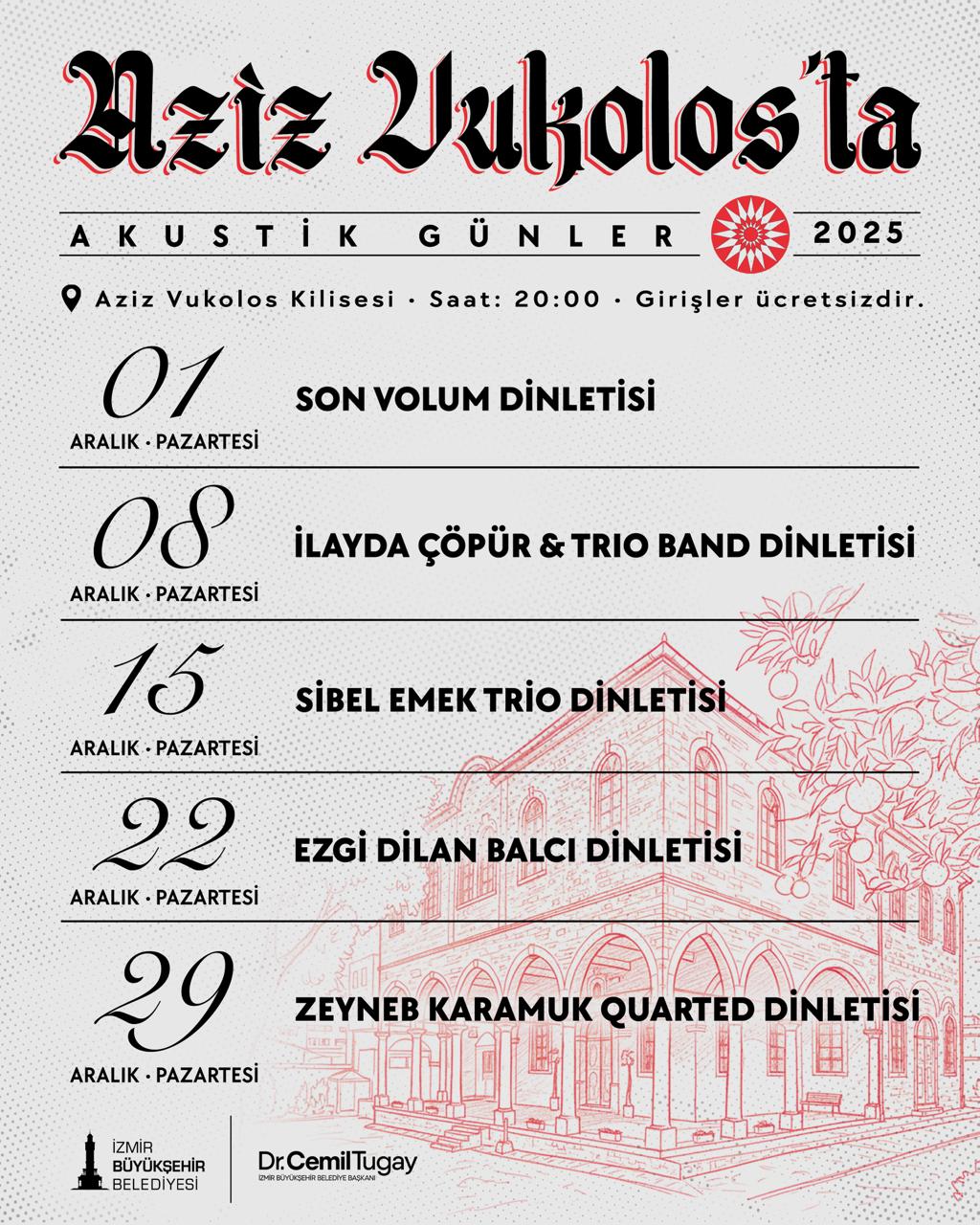 Aziz Vukolos Kilisesi’nde İzmir Büyükşehir Belediyesi organizasyonuyla Akustik Günler programı gerçekleştirilecek. 3-10-17-24 Kasım ve 1-8-15-22-29 tarihlerinde farklı müzik türlerinde yapılacak konserler, ücretsiz olacak.