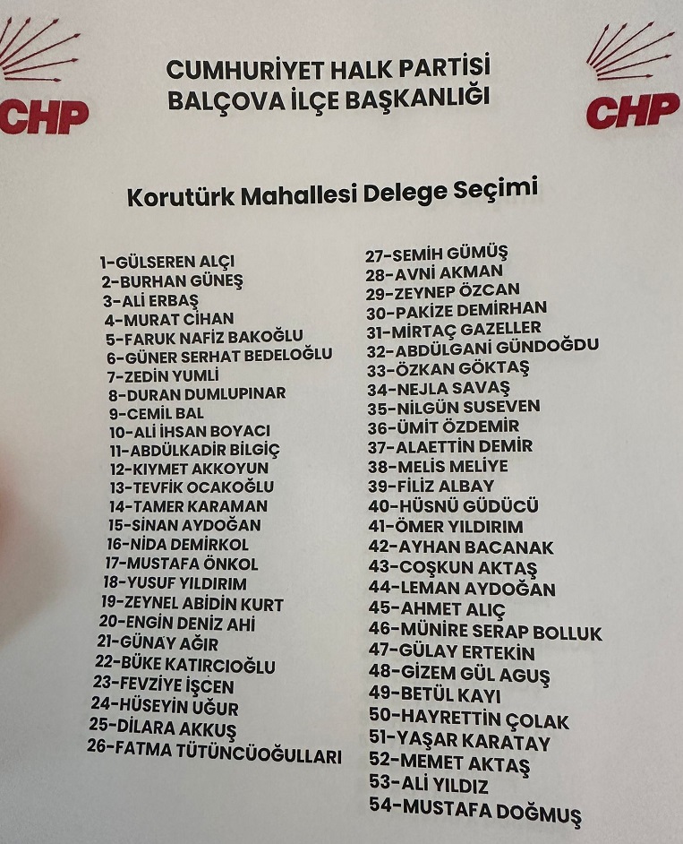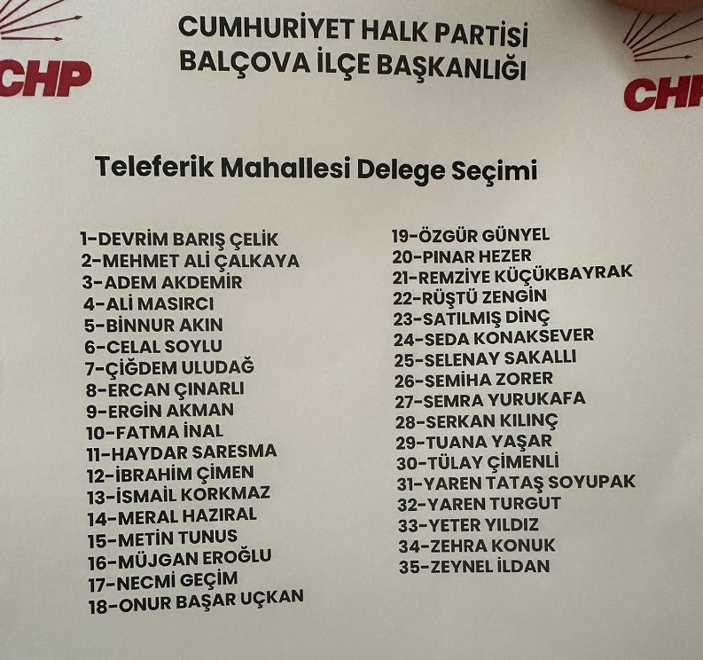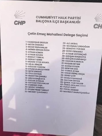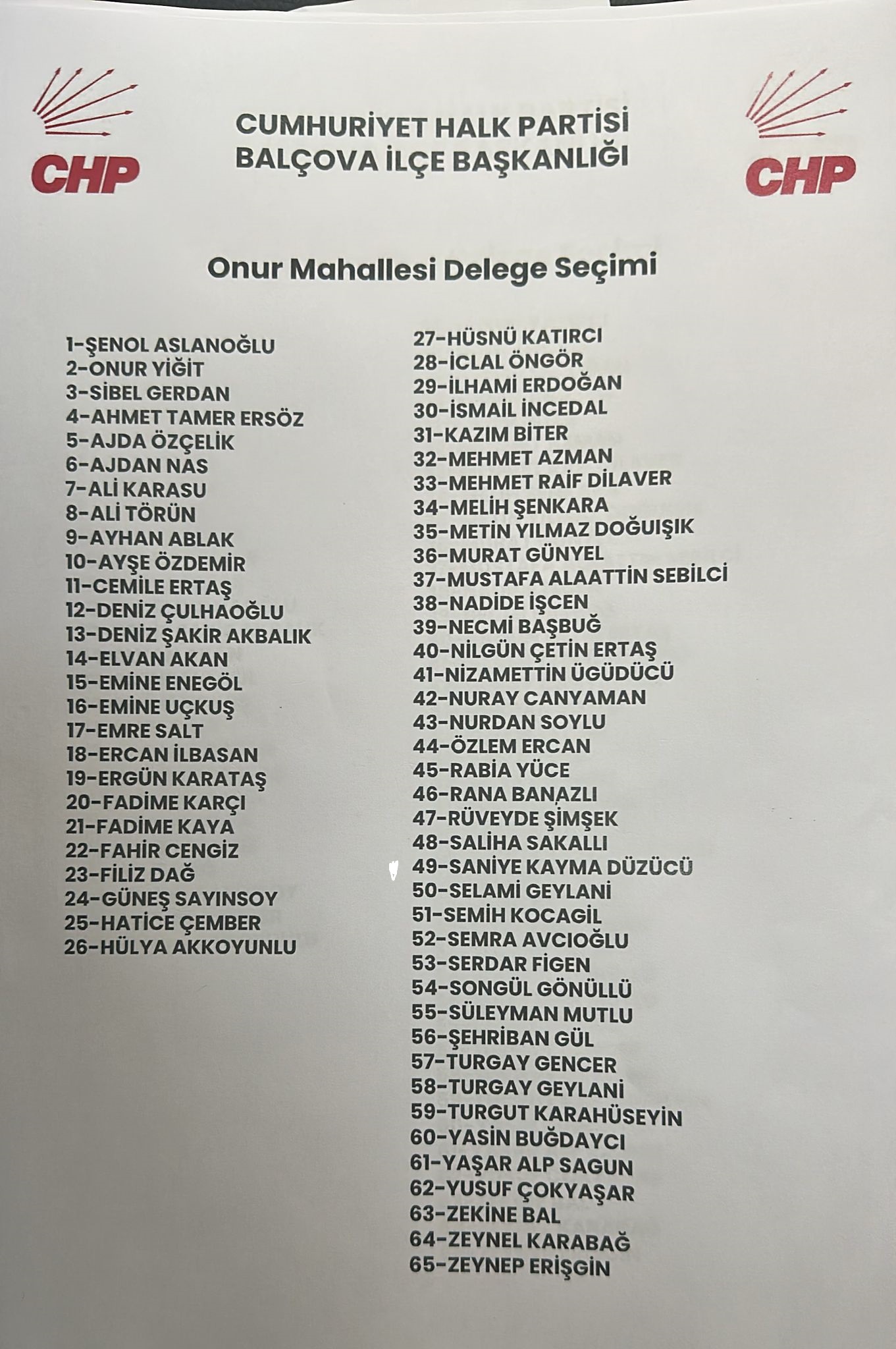 İl Başkanı Şenol Aslanoğlu’nun liste başı, Belediye Başkanı Onur Yiğit’in ikinci sırada yer aldığı Onur Mahallesi’nde 65 delege belli oldu. Balçova’da eski belediye başkanı Mehmet Ali Çalkaya, 37. Dönem Genel Başkan Yardımcısı Devrim Barış Çelik, Kadın Kolları MYK Üyesi Sibel Gerdan, Gençlik Kolları MYK Üyesi Handenur Erdilek, eski PM Üyesi Gülseren Alçı gibi önemli isimler listelerde yer aldı.