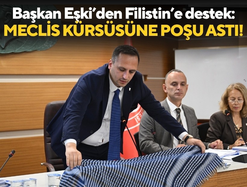 Başkan Eşki'den Filistin'e destek: Meclis kürsüsüne simge poşuyu astı!
