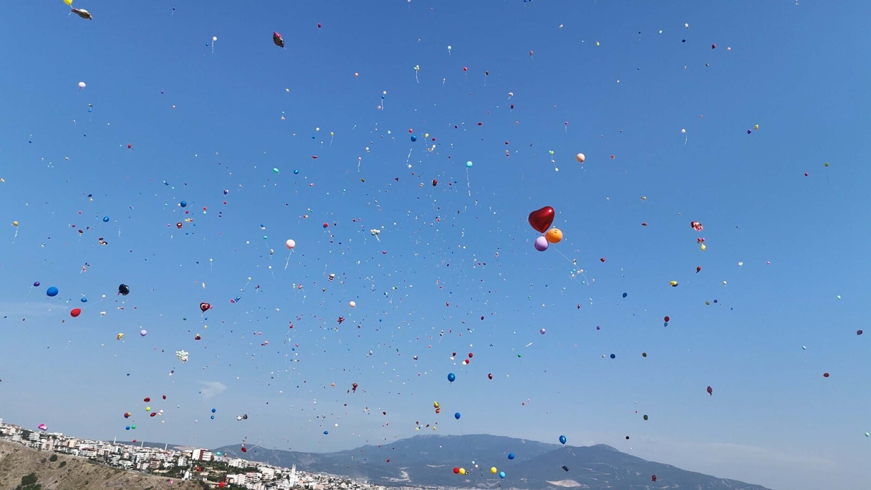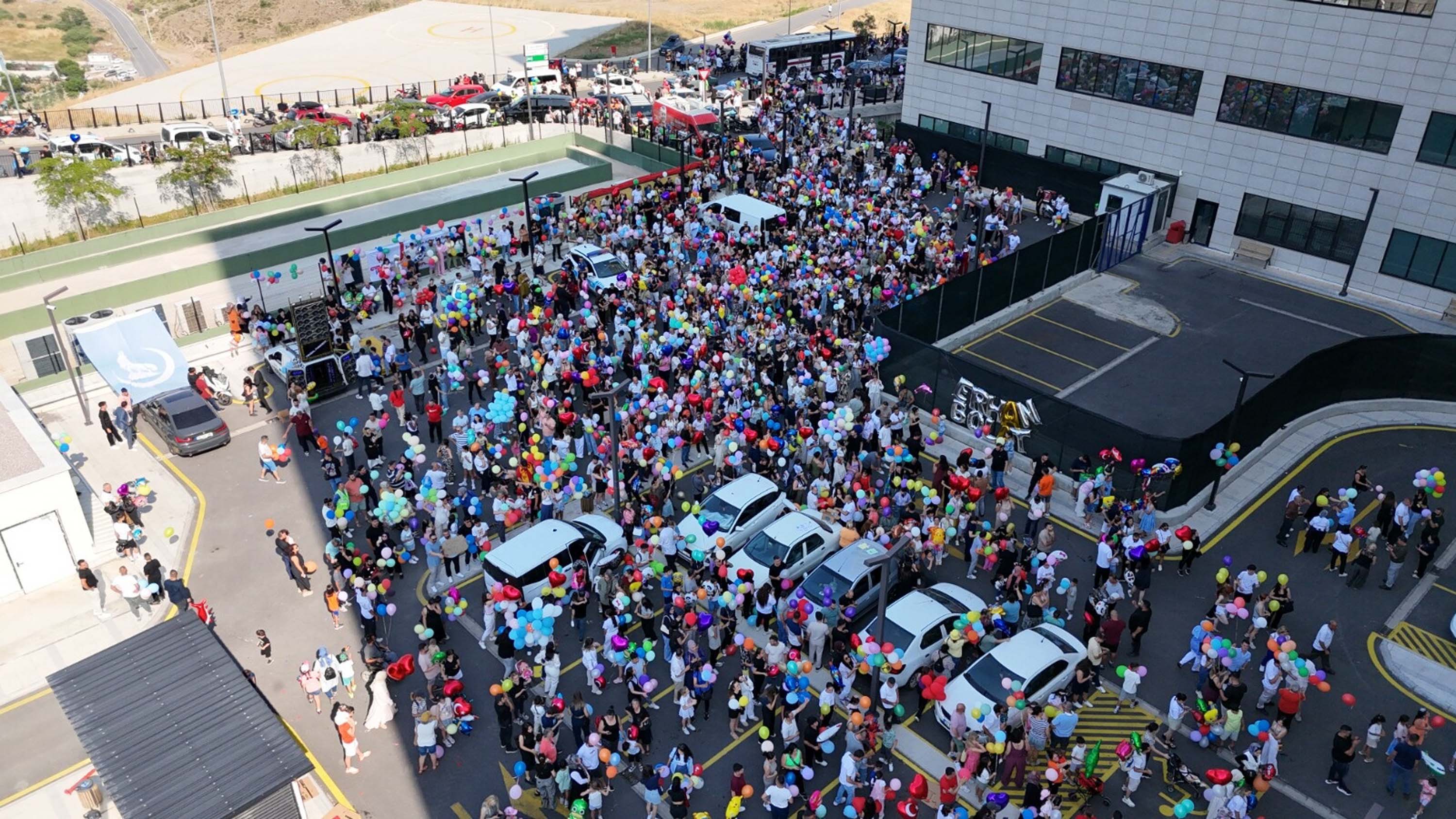 Çağrı üzerine 7 Haziran Kurban Bayramı'nın ikinci günü onkoloji servisinin önünde toplanan her yaştan çok sayıda kişi ellerindeki balonları gökyüzüyle buluşturdu.