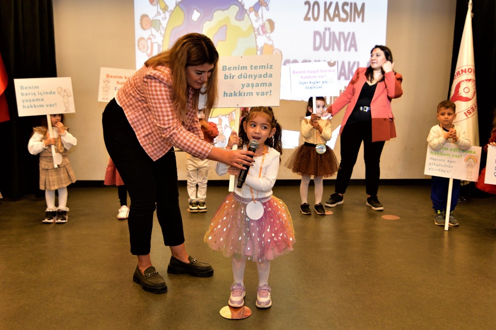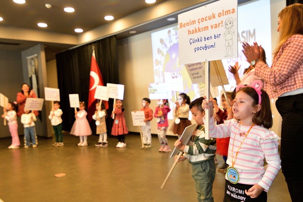 Bornova Belediyesi Ana Hizmet Binası önünde bir araya gelen çocuklar, ellerinde çocuk haklarını anlatan renkli pankartlarla Büyükpark içindeki Uğur Mumcu Kültür ve Sanat Merkezi’ne yürüdü. Burada ilk olarak 10 yaşındaki 4. sınıf öğrencisi Aşk Nefes Koca, Dünya Çocuk Hakları Günü’ne özel olarak hazırlanan manifestoyu okudu.