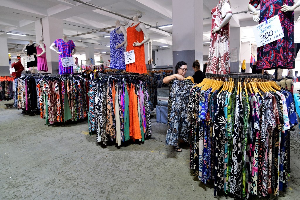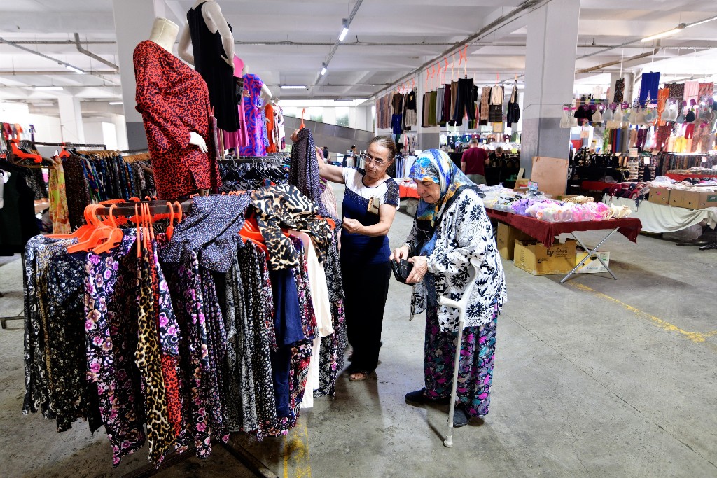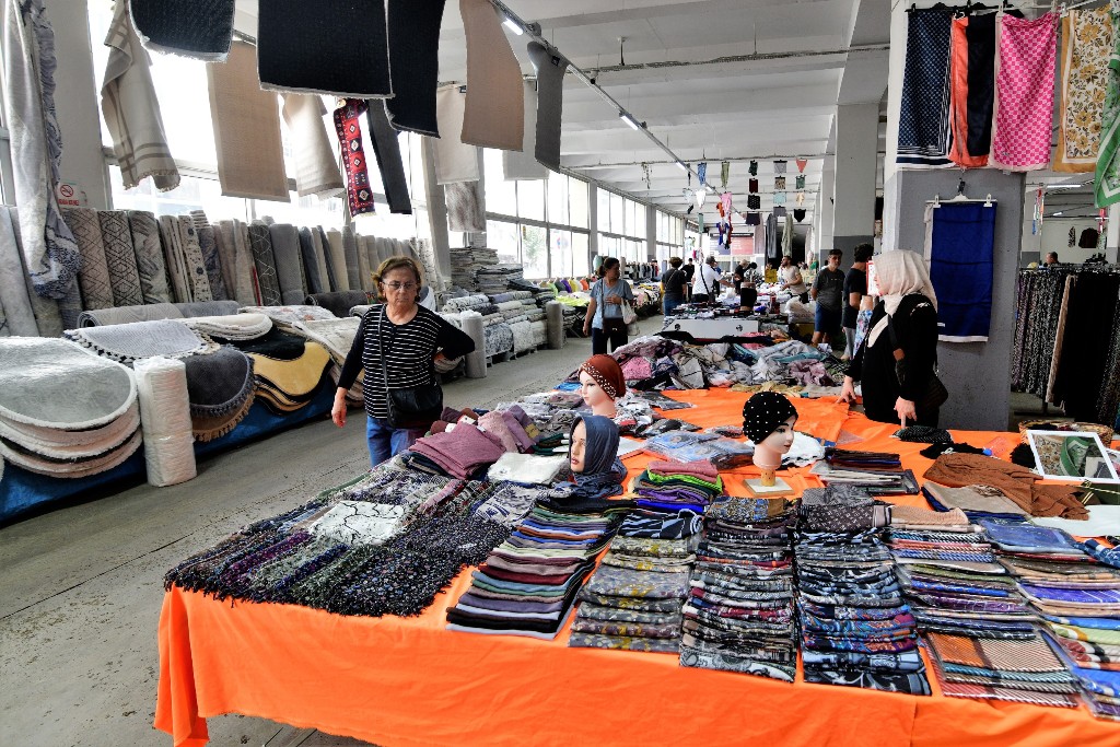Pazarda her türlü kıyafetin yanı sıra halı, ayakkabı, tekstil ürünleri ve mutfak malzemeleri de yer alıyor.