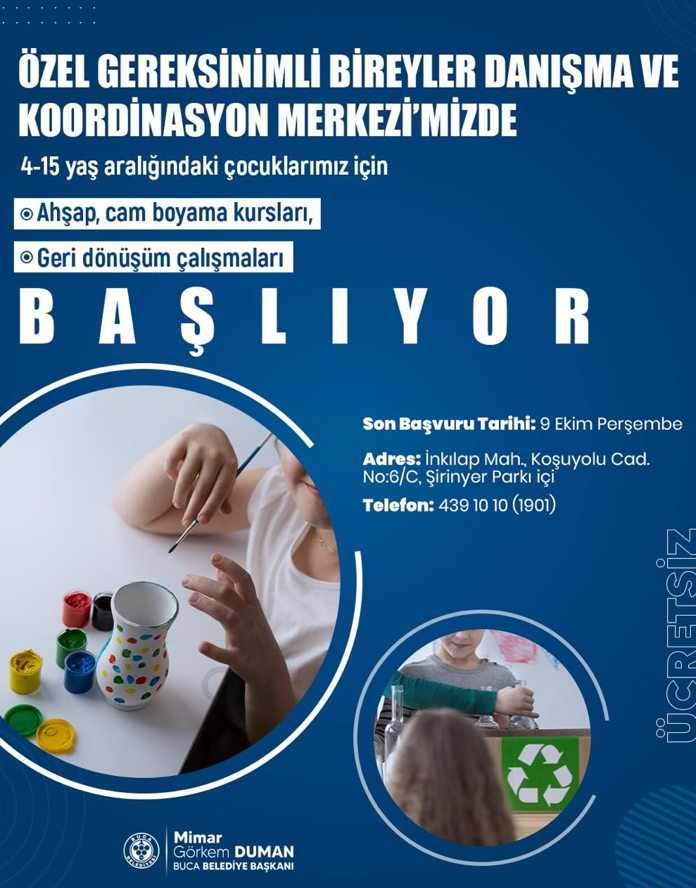 Buca Belediyesi, ilçede yaşayan özel gereksinimli çocukların sosyal yaşamda var olabilmeleri, becerilerini geliştirerek yeni şeyler öğrenebilmeleri için ahşap, cam boyama ve geri dönüşüm kursları açıyor. Şirinyer’de bulunan Özel Gereksinimli Bireyler Danışma ve Koordinasyon Merkezi’nde açılacak kurslardan 4 ila 15 yaş aralığındaki özel gereksinimli çocuklar faydalanabilecek. Kurslar için son başvuru tarihi 9 Ekim Perşembe günü olarak belirlenirken kurslardan faydalanmak isteyen vatandaşlar, 439 10 10 (dâhili 1901) numaralı telefon hattını arayarak bilgi alabilecekler.