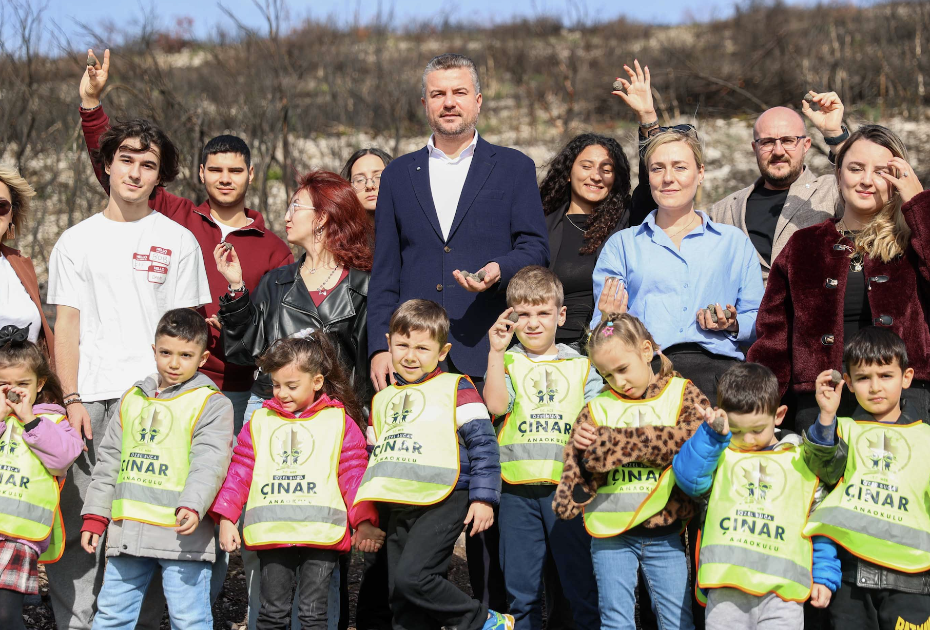 Buca Belediyesi, yangından etkilenen alanların doğal dengesine katkı sağlamak amacıyla Bucalı minik öğrencilerin katılımı ile örnek bir çalışmaya imza attı.