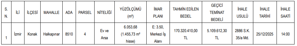 İzmir Büyükşehir Belediyesi, Konak Halkapınar’da yer alan taşınmazı ihale yöntemiyle satışa çıkarıyor. Satışın gerçekleşmesi halinde en az 170 milyon 320 bin TL gelir elde edilecek.