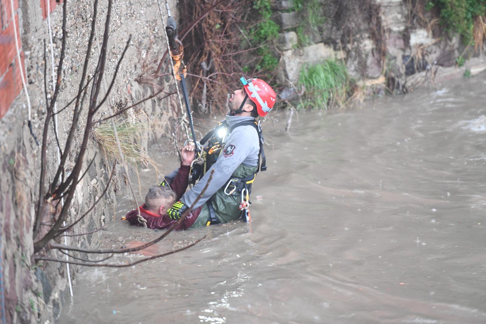 Su seviyesinin yaklaşık 2 metreye ulaştığı dereye vinç yardımıyla inen ekipler vatandaşı bulunduğu noktadan kurtardı. Sedye ile yaklaşık 10 metrelik duvardan çıkarılan yurttaş, sağlık ekiplerine teslim edilerek hastaneye sevk edildi.