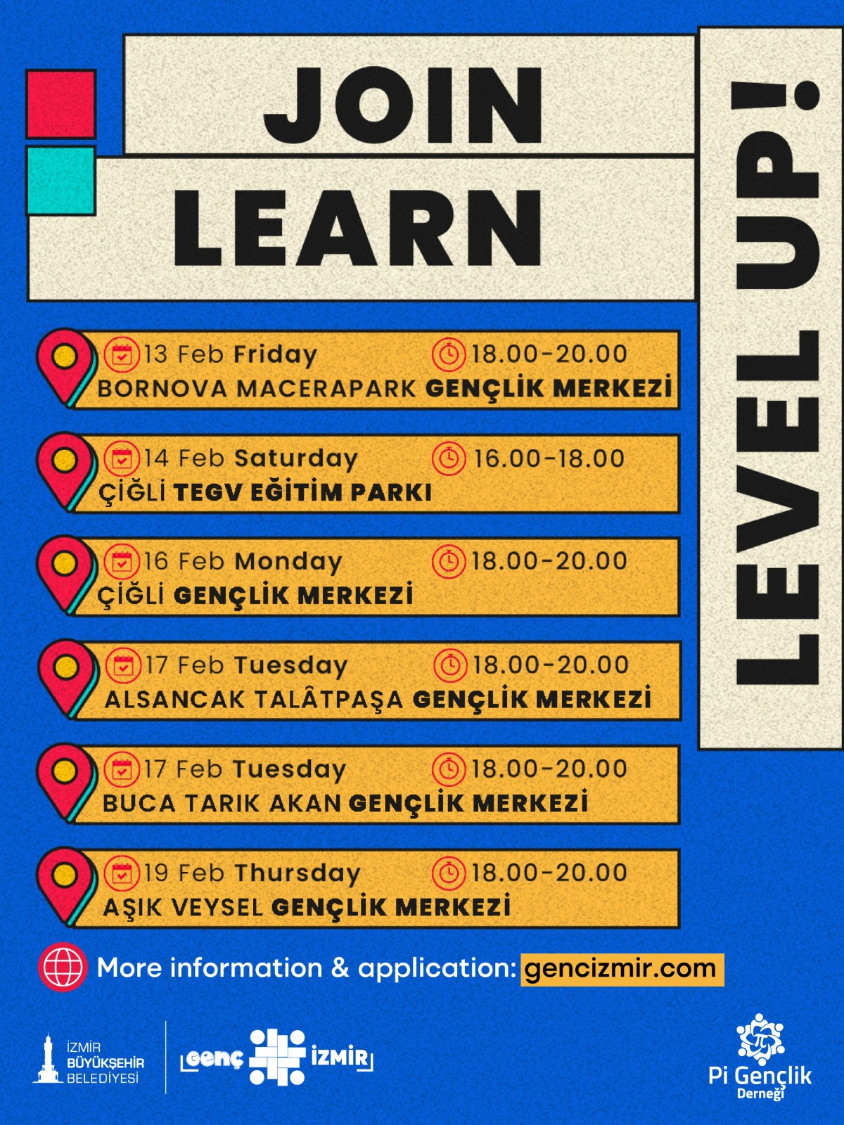 İngilizce Konuşma Kulüpleri; 13 Şubat 18.00 – 20.00 saatleri arasında Bornova Macera Park Gençlik Merkezi’nde, 14 Şubat 16.00-18.00 saatleri arasında Çiğli TEGV Eğitim Parkı’nda, 17 Şubat’ta18.00 -20.00 saatleri arasında Alsancak Talatpaşa Gençlik Merkezi ile Buca Tarık Akan Gençlik Merkezi’nde ve 19 Şubat’ta 18.00 ile 20.00 saatleri arasında Aşık Veysel Gençlik Merkezi’nde olacak.
