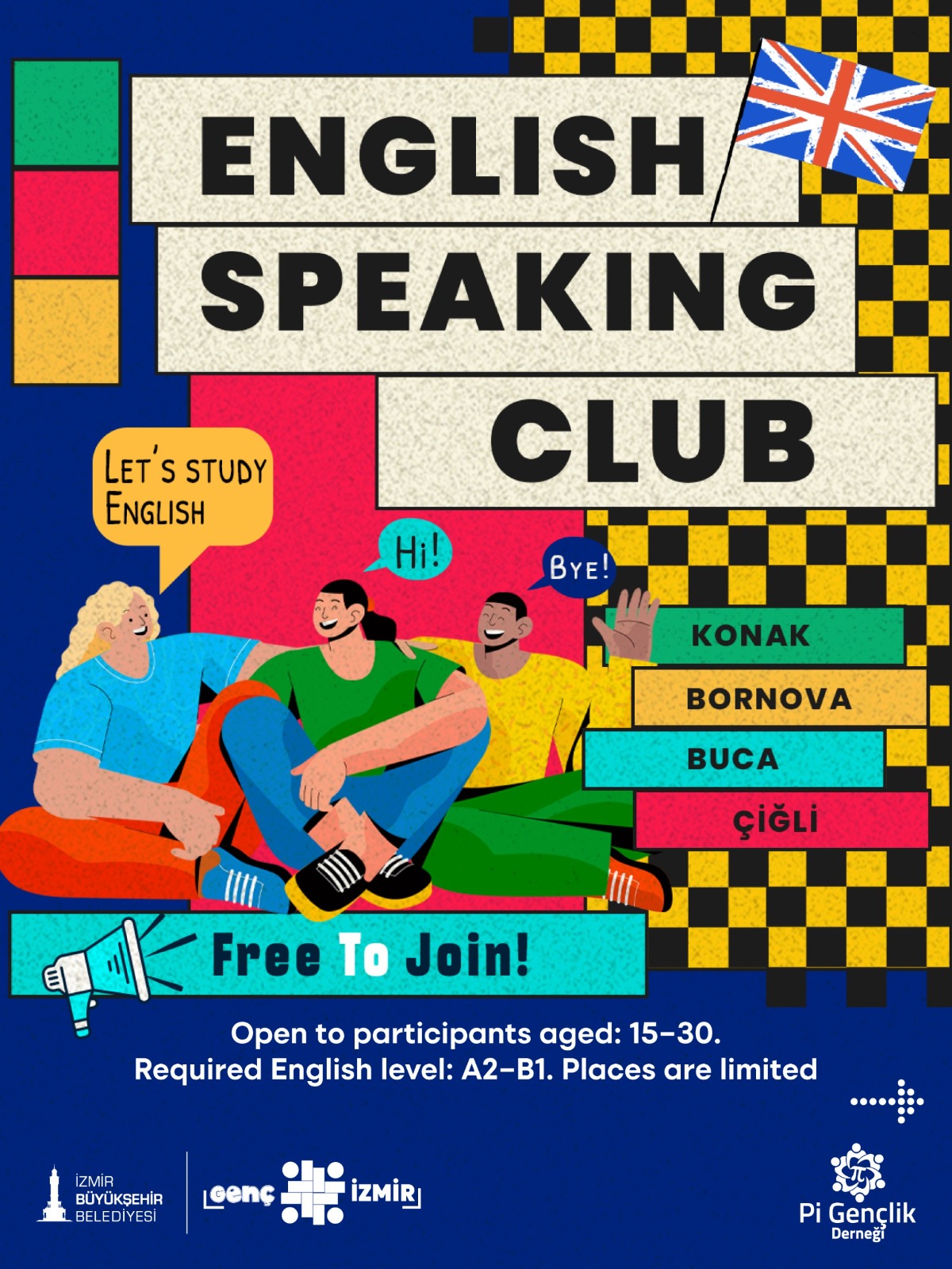 15–30 yaş aralığındaki gençlere açık olan programa, A2–B1 seviyesinde İngilizce bilgisine sahip katılımcılar başvurabiliyor. Ücretsiz olarak düzenlenen etkinliklerin kontenjanı sınırlı. Öte yandan, İngilizceye daha kapsamlı bir başlangıç yapmak isteyen gençler için 16 Şubat Pazartesi günü Alsancak Talâtpaşa Gençlik Merkezi’nde başlayacak, toplam 60 saatlik İngilizce eğitim programı da başvurulara açık. “English Speaking Club” etkinlikleri ile İngilizce eğitim programına ilişkin detaylı bilgi ve başvuru koşullarına gencizmir.com adresinden ulaşılabiliyor.