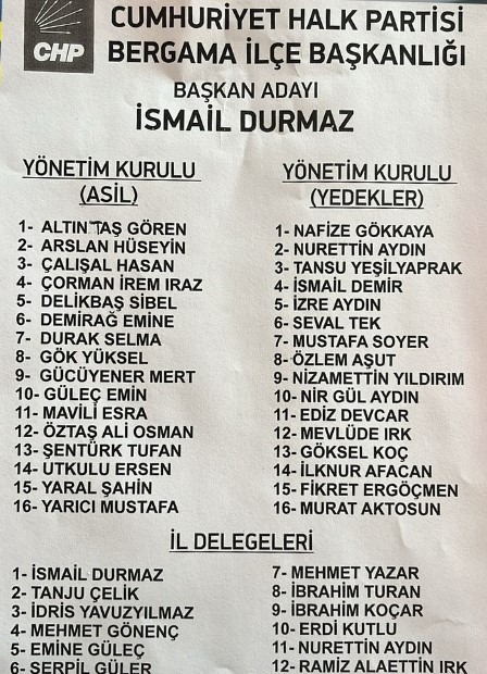 CHP'nin ilçe kongrelerinde sona gelinirken bugün Bergama’da mevcut ilçe başkanı İsmail Durmaz, tek aday olarak seçime girdi ve güven tazeledi.