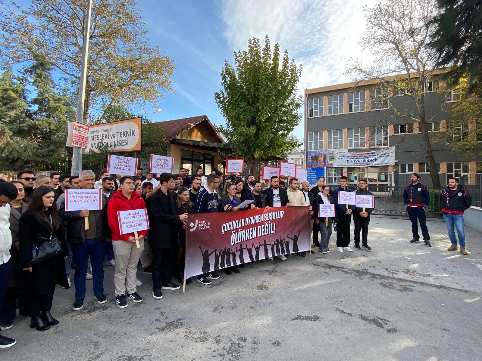 Cumhuriyet Halk Partisi İzmir İl Gençlik Kolları, Mesleki Eğitim Merkezleri'nde (MESEM) okuyan çocukların ucuz iş gücü olarak görülmesi ve MESEM’lerde meydana gelen çocuk ölümlerine dikkat çekmek için Konak Çınarlı Mesleki ve Teknik Anadolu Lisesi önünde basın açıklaması yaptı.