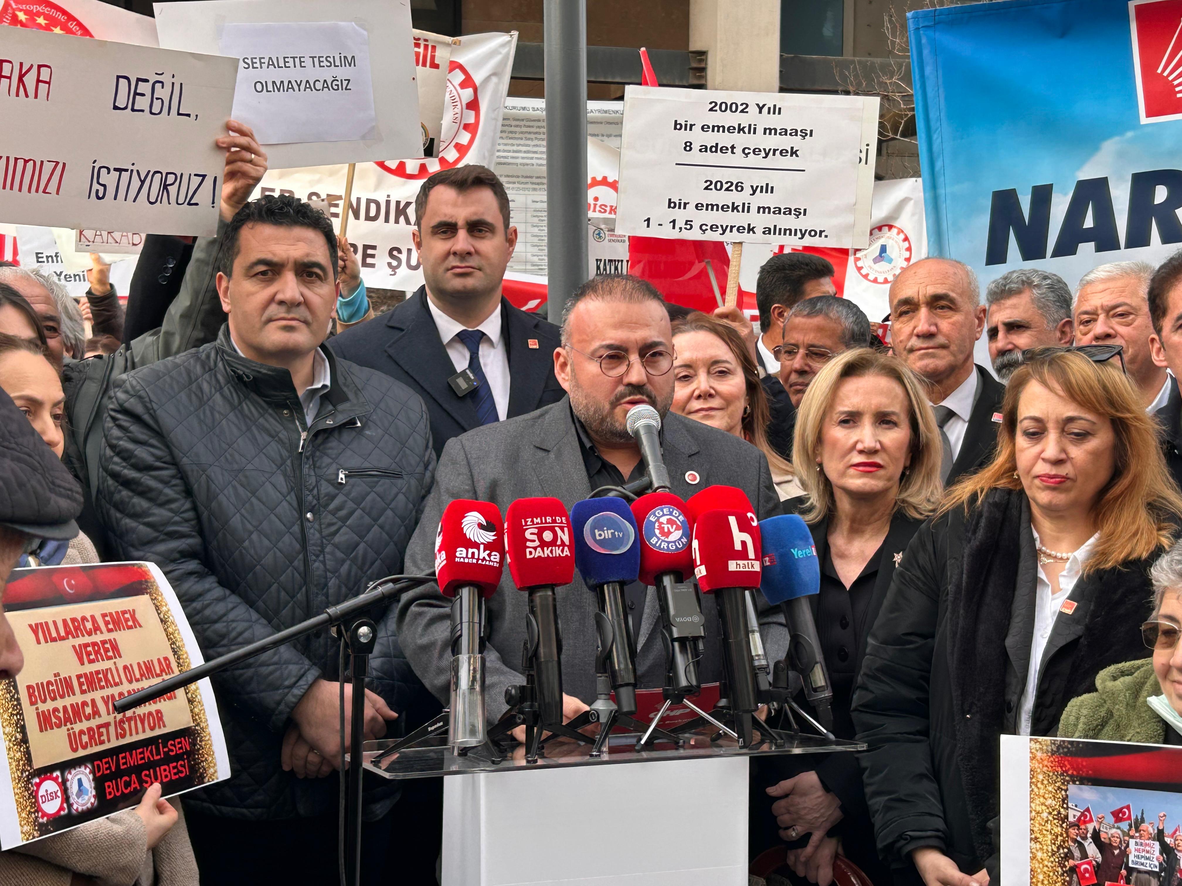 CHP İzmir İl Başkanı Çağatay Güç, “Bugün burada bir rakam değil bir hayat gerçeğini konuşuyoruz. Bir bütçe kalemini değil insanların onur mücadelesini konuşuyoruz. Ay sonunu değil gününü nasıl geçireceğini düşünüyor. Eczaneye giderken tedirgin olan, pazarda ne alacağını bilmeyen, her şeyi yarım alan bir emekli gerçeği var. Yıllarca bu ülkeye hizmet eden biri torununa harçlık veremediği için başını eğmek, ilaçta katkı payını hesaplamak, elektrik faturasını öderken mutfağını düşünmek zorunda mı? Bu düzen adil değil. AKP iktidara ilk geldiğinde emekli maaşı ile 8 çeyrek altın alınırken şu an bir buçuk çeyrek altın alınıyor. Bu emekli maaşının nasıl eridiğinin gerçeğidir. Eskiden emekli bugünün parası ile 96 bin TL alım gücüne sahipti, şu anda yaşam mücadelesi veriyor. Mesele sadece emekli meselesi de değil. İşçiler, memurlar yani toplumun orta direği aynı baskıyı yaşıyor. Ayın ortasında maaşı biten, borç içinde yaşayan ve çocuğunun ihtiyacını erteleyen bir düzen var. Emekli maaşı yaşamak için yeterli olacak, hayatta kalmak için değil! Biz halkımızla AKP gibi inatlaşmayacağız, halkımızın sesine kulak vereceğiz. İnsanca yaşatacak bir düzen kuracağız” ifadelerini kullandı.
