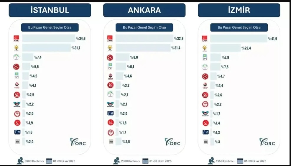 Türkiye’de siyasetin gündemi son haftalarda hızla değişirken, partilerin oy oranlarındaki dalgalanmalar da vatandaşların en çok merak ettiği konular arasında yer alıyor. ORC Araştırma tarafından yapılan son kamuoyu araştırması, İstanbul, Ankara ve İzmir’de seçmenin eğilimini ortaya koydu. “Bu pazar genel seçim olsa hangi partiye oy verirsiniz?” sorusunun yöneltildiği ankette dikkat çeken sonuçlar elde edildi.