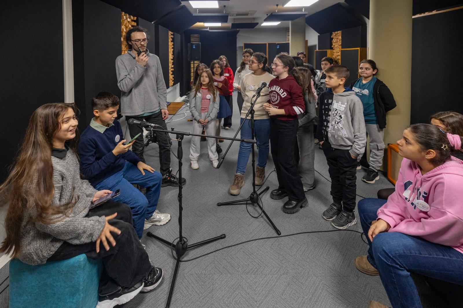 İzmir Çocuk Meclisi üyeleri, yarıyıl tatilinde kentin farklı noktalarında yer alan İzmir Büyükşehir Belediyesi birimlerini gezerek hem bilgi ediniyor hem de keyifli vakit geçiriyor. Genç müzisyenler için açılan ücretsiz müzik stüdyosu uygulaması Stüdyo Kültürpark’ı da ziyaret eden meclis üyeleri, hayatlarında ilk kez podcast kaydı yapma deneyimi yaşadı.
