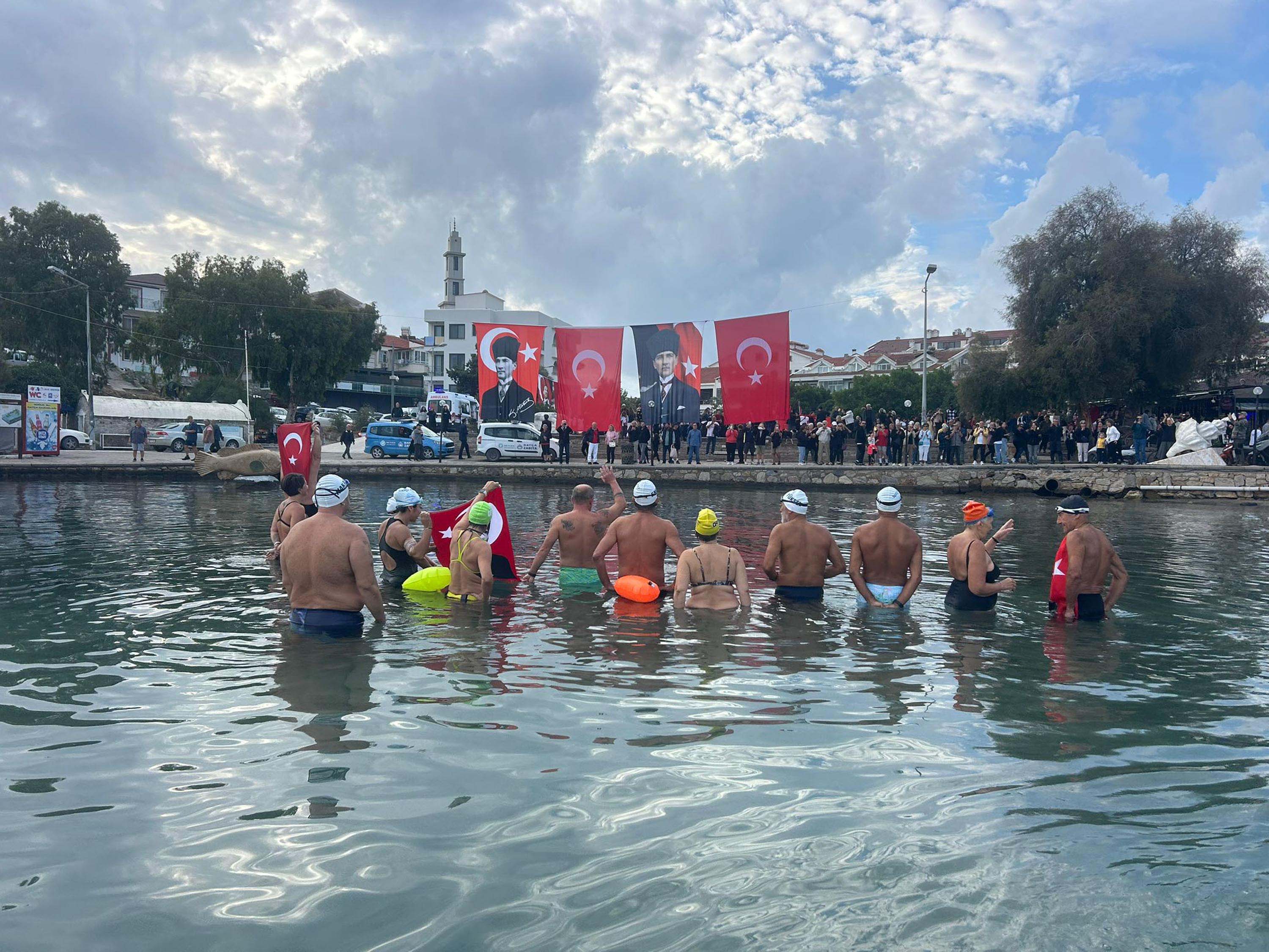 Muğla’nın Datça ilçesinde, açık deniz yüzme sporcuları 10 Kasım Atatürk’ü Anma Günü kapsamında 09.05’te denizde saygı duruşunda bulunup, 'Bir Çift Mavi Gözün Işığında' sloganıyla kulaç attı.