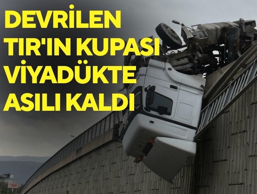 Devrilen TIR'ın kupası viyadükte asılı kaldı; şoförü yaralandı