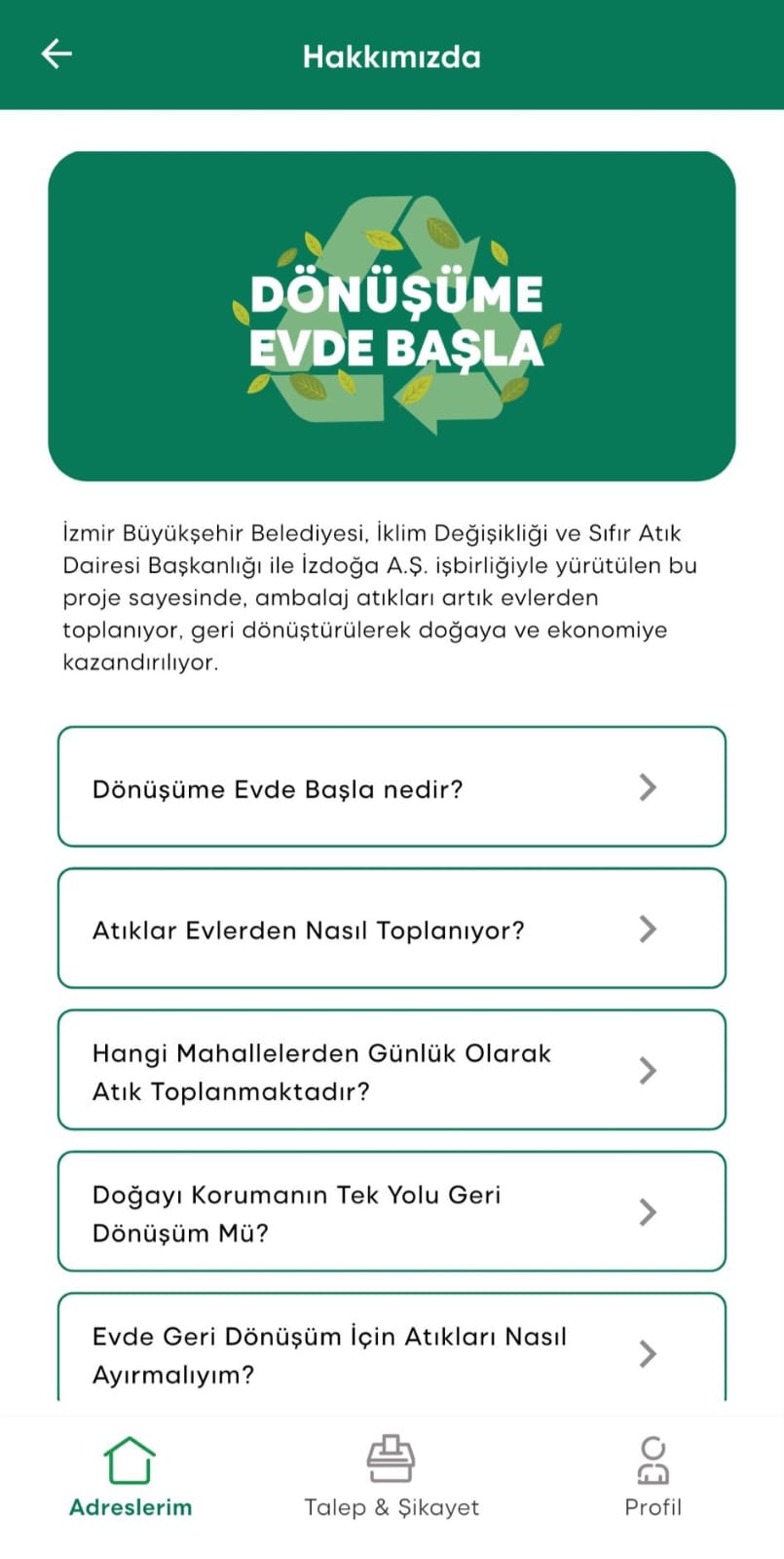 Avrupa ülkelerinin öncülük ettiği kapıdan kapıya atık toplama uygulamasını geçen aylarda İzmir’de hayata geçiren İzmir Büyükşehir Belediyesi, 8 ilçe ve 14 mahallede projeye devam ediyor. Katı atık depolama alanlarına giden ambalaj atıklarını azaltma, sıfır karbon hedefi, çevreyi koruma ve bu atıkların tekrar ekonomiye kazandırılmasını hedefleyen “Dönüşüme Evde Başla” projesinde yer alan ilçe ve mahallelerde yaşayan vatandaşlar için artık mobil uygulama da var. Uygulama ile vatandaşlar istek ve şikâyetlerini iletebiliyor. Projeyle tesis ile doğrudan iletişim sağlanması, yaşanan aksaklıklara çok daha hızlı çözüm üretilebilmesi hedefleniyor.