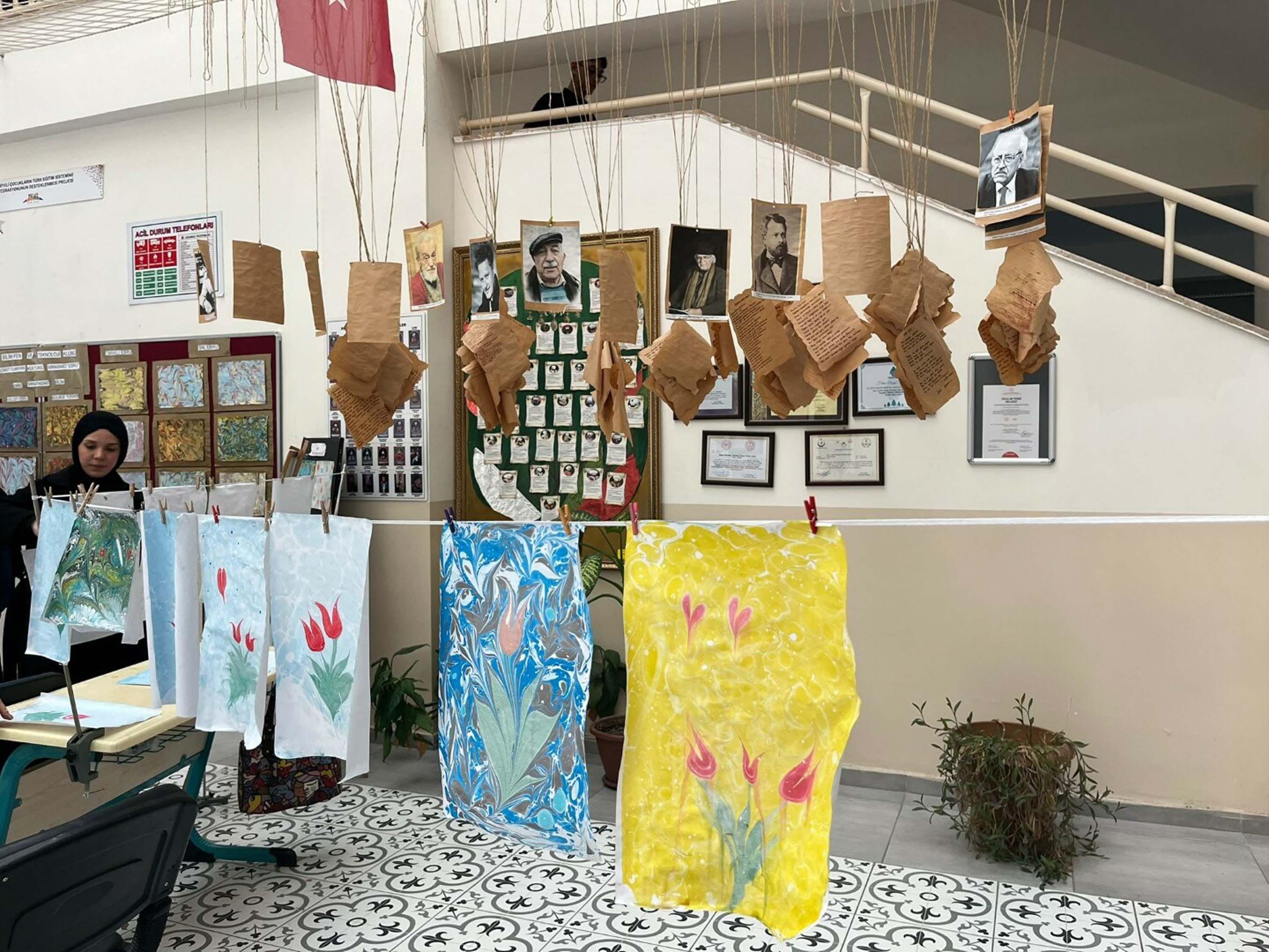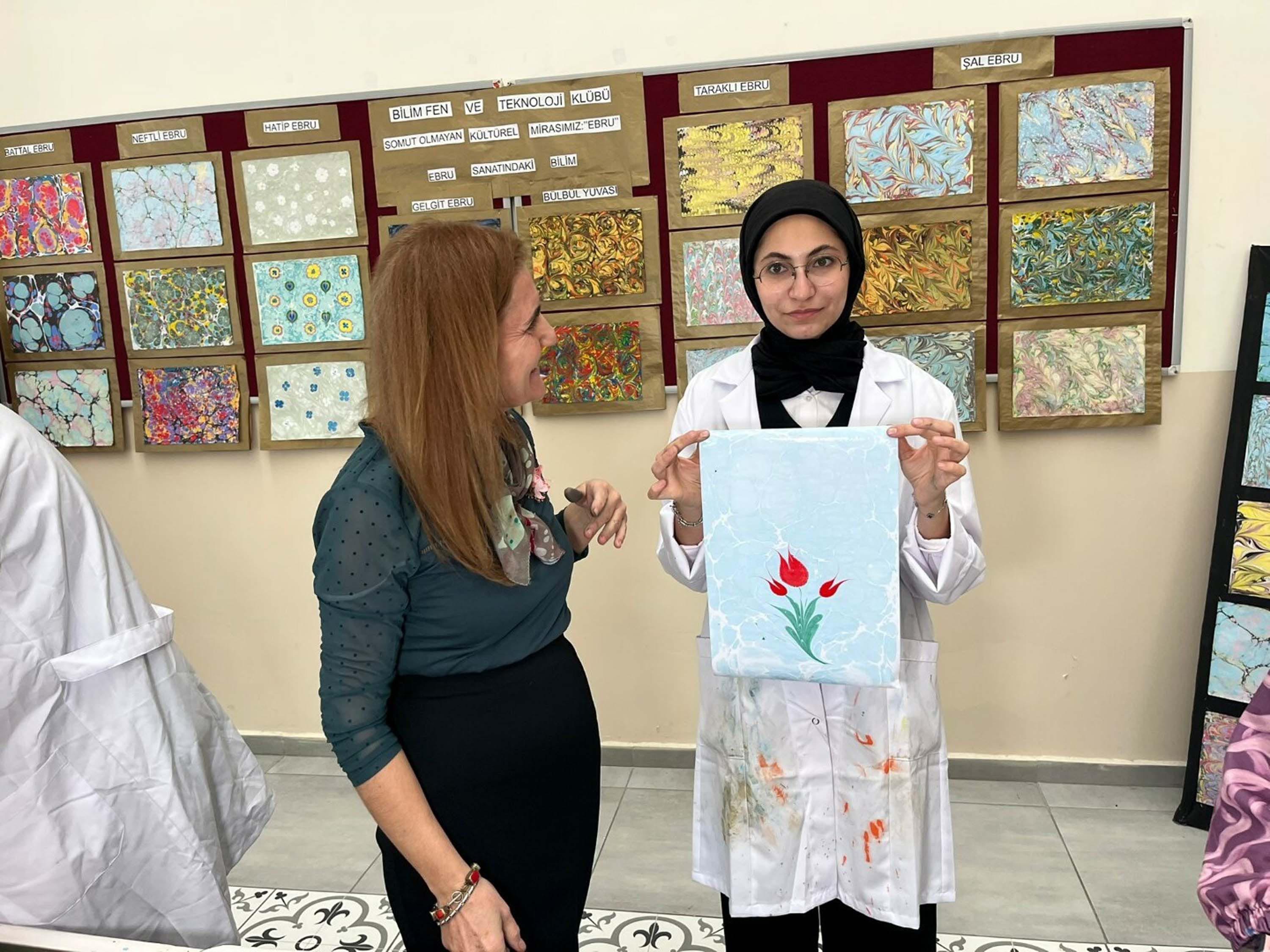 Dilek Hasırcı, öğrencilerinin 3 aydır birçok ebru sanatı türünü yaptığını belirtip, "Kitap ayraçları, kitap kapları, ebrunun üzerine hat sanatları gibi ilgi çekici hale getirdikleri tablolar da yapıp hazırlığımızı tamamlayacağız. Öğrencilerim hem sanatı icra ederken hem de her aşamasında bilimi de görmüş oluyorlar. Deneyimleyerek, sanat ile bilimin iç içe olduğunu da öğrenmiş oluyorlar. İkisi bir arada olduğunda disiplinler arası çok daha güzel şeyler ortaya çıkıyor" ifadelerini kullandı.