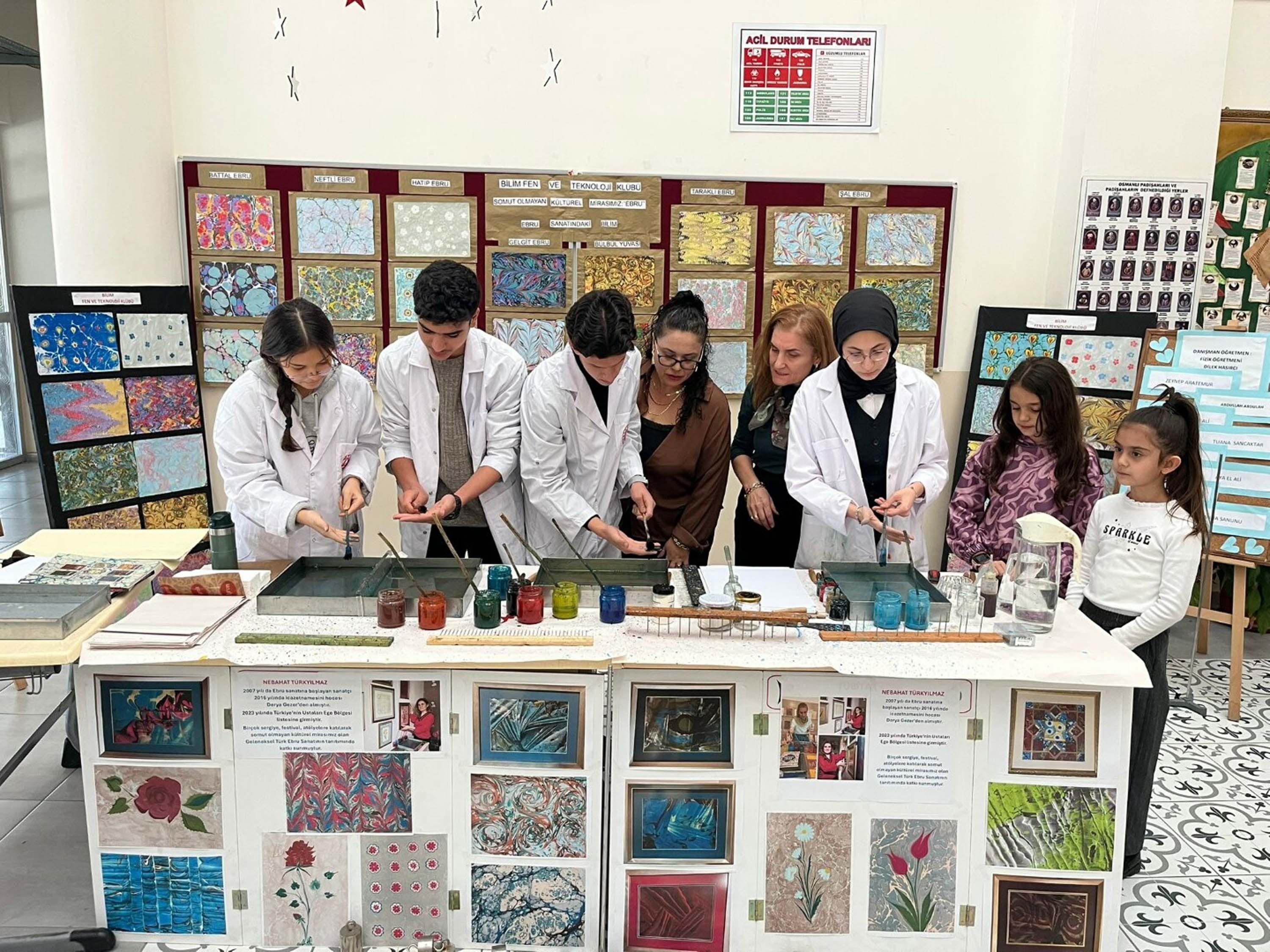 Ebru sanatçısı Nebahat Türkyılmaz da ebru sanatını tanıtmak için birçok davet aldığını belirtip, "Bunlardan biri de öğrencilerimizi hem geleneksel sanat ile tanıtmak hem de sanatın içinde yer alan bilimi anlatmak adına buraya gelmek oldu. Öğrencilerin ebru sanatının içindeki fizik kurallarını deneyimleyerek öğrenmeleri, bilgilerini daha kalıcı hale getiriyor. Çocukların gözlerinde görmüş olduğum ışıltı ve sanata olan merak ve ilgilileri beni çok mutlu etti. Böylelikle aslında sanatın her yerde olduğunu bir kez daha görmüş oluyoruz" dedi.