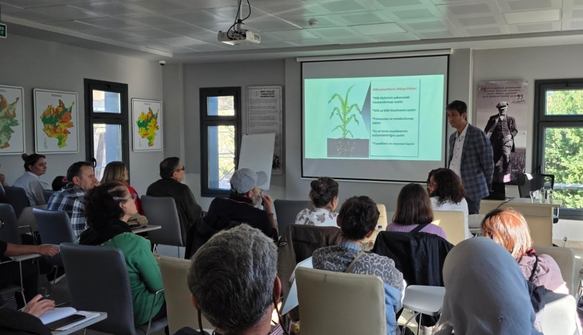Prof. Dr. Murat Yabanlı, “Plastik kirliliğinin tarımdaki örnekleri” hakkında Toprak Okulu’nda katılımcılara bir sunum yaptı. Yaptığı sunumda plastik kullanımı ve plastik atıklarının canlılar, toprak ve doğa üzerindeki etkileri hakkında bilgi veren Prof. Dr. Murat Yabanlı; “Türkiye 5,5 milyon ton plastik atık ile plastik kirliliği sıralamasında dünyada 9. sırada yer alıyor. Plastik, ucuz ve hafif olması nedeniyle gıda ambalajı olarak sıklıkla tercih ediliyor. Plastik aynı zamanda günlük hayatın ayrılmaz bir parçası olmuş durumda. Bir plastik poşetin 20 yılda yok olduğu söyleniyor ama yok oluş söz konusu değil aslında. Plastikler giderek ufak parçalara dönüşüyor en sonunda nano plastik parçalar kalıyor. Bu parçaların doğada hareketi devam ediyor. Gözle görülmeyen plastiklere mikro plastik adını veriyoruz. Her yıl 8 milyon ton plastik denizlere karışıyor. Denizlere karışan plastik denizlerdeki canlı yaşamını da olumsuz etkiliyor. Tüm bunların önüne geçmek için tek kullanımlık ürünleri hayatımızdan çıkarmalıyız. Plastik su şişeleri yerine matara kullanımı yaygınlaşmalı, geri dönüşüm bilinci kazandırılmalı. Plastik poşetler yerine bez torbalar kullanılmalı” bilgisini verdi.