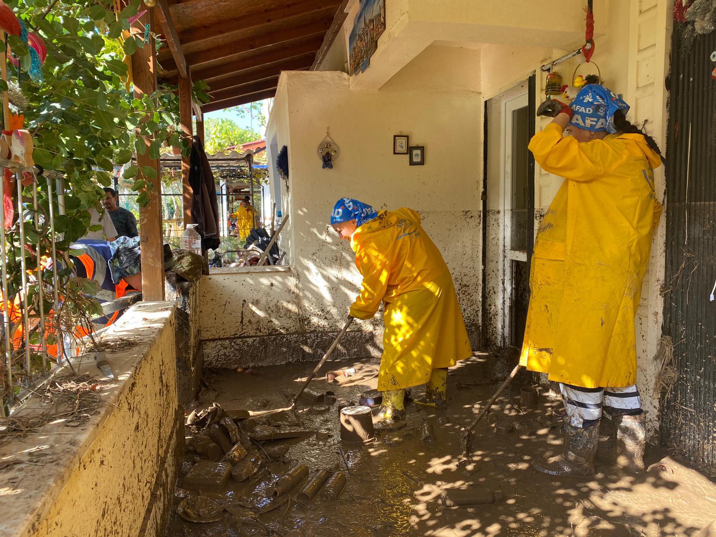 Sağanağın en fazla etkilediği yerlerden Mustafa Kemal Atatürk Mahallesi'nde AFAD gönüllüleri ve belediye ekipleri tarafından su basan evler ve sokaklardaki çamur tabakaları temizleniyor.