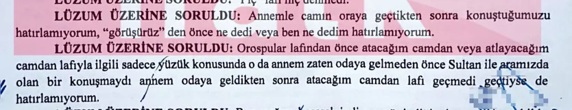 Gülter, "Atacağım camdan veya atlayacağım camdan lafıyla ilgili sadece yüzük konusunda o da annem zaten odaya gelmeden önce Sultan ile aramızda olan bir konuşmaydı. Annem odaya geldikten sonra atacağım camdan lafı geçmedi, geçtiyse de hatırlamıyorum" ifadelerini kullandı.