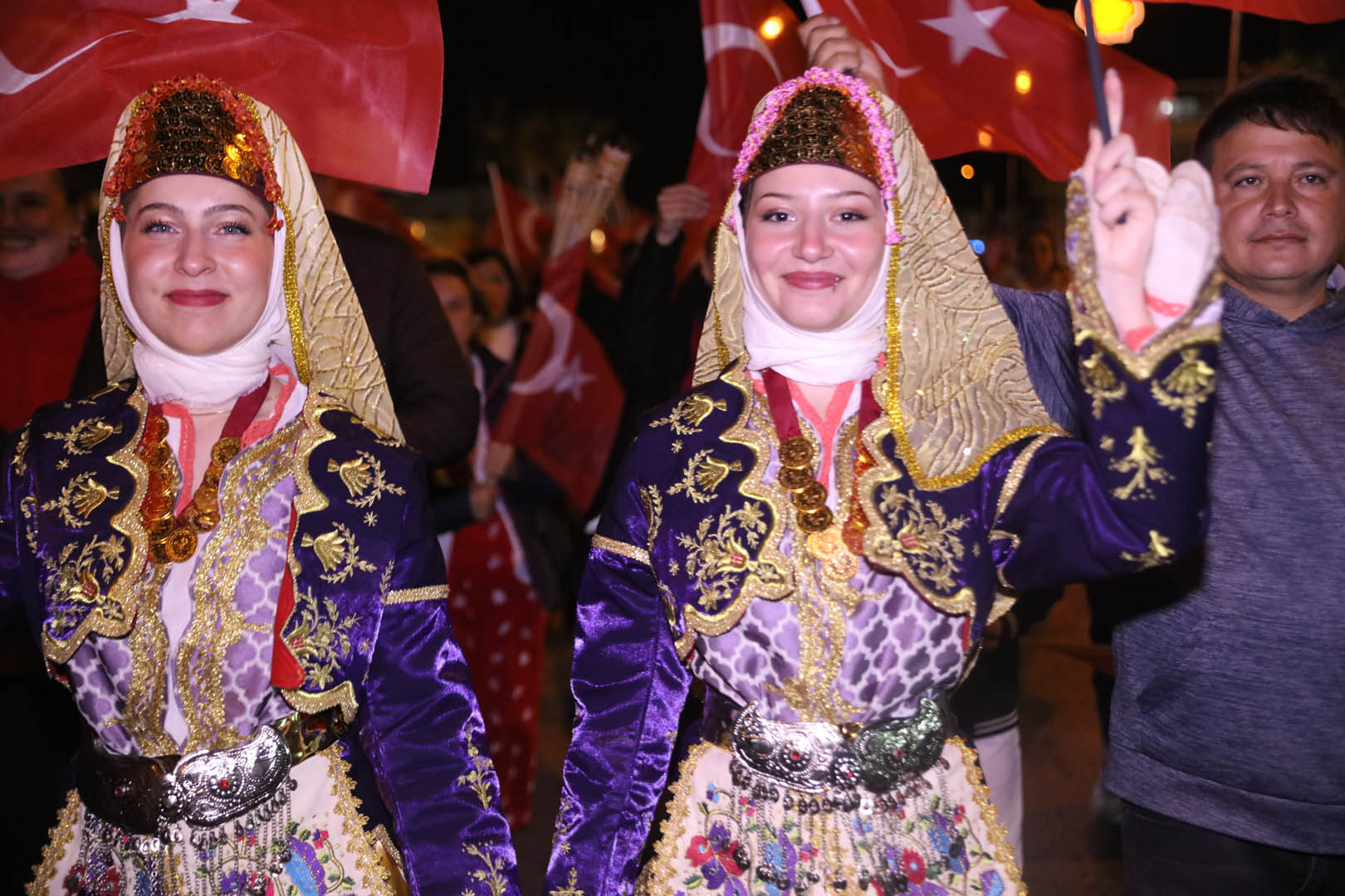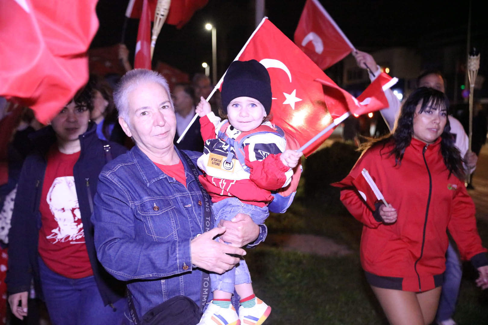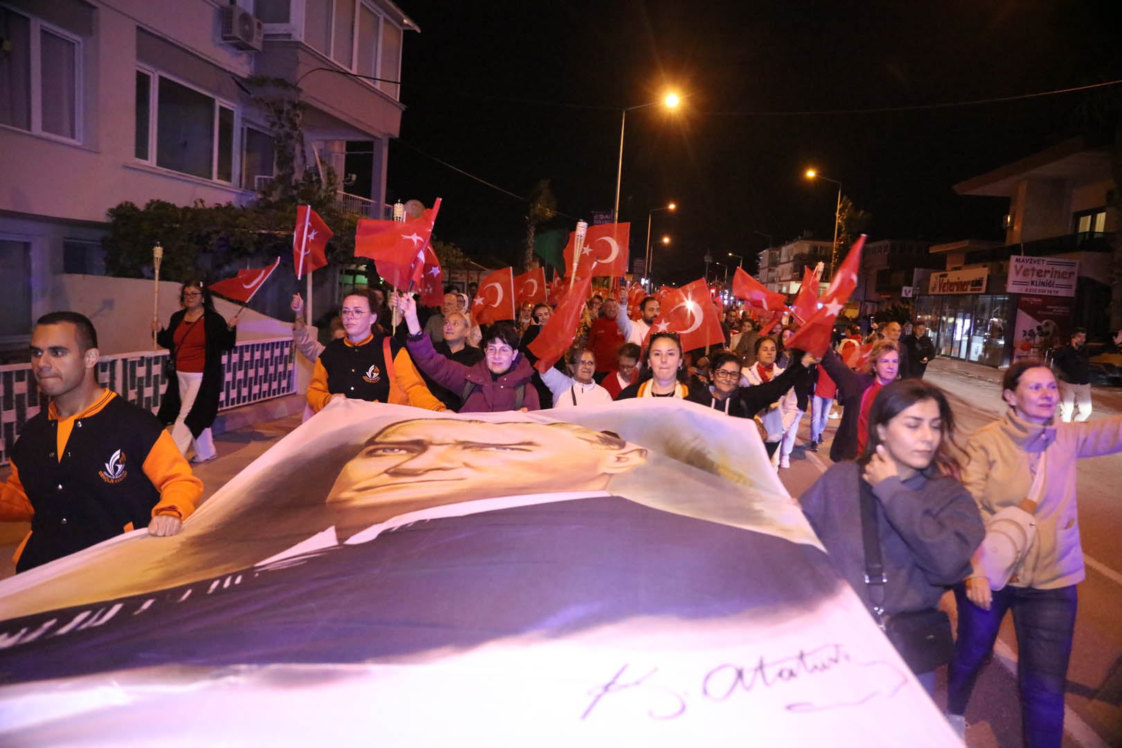 Güzelbahçe Maltepe Mahallesi Tabaoğlu Parkı’nda toplanan Cumhuriyet sevdalısı yüzlerce Güzelbahçeli, ellerinde meşale ve Türk bayraklarıyla yaklaşık iki kilometre sahil boyunca yürüdü.