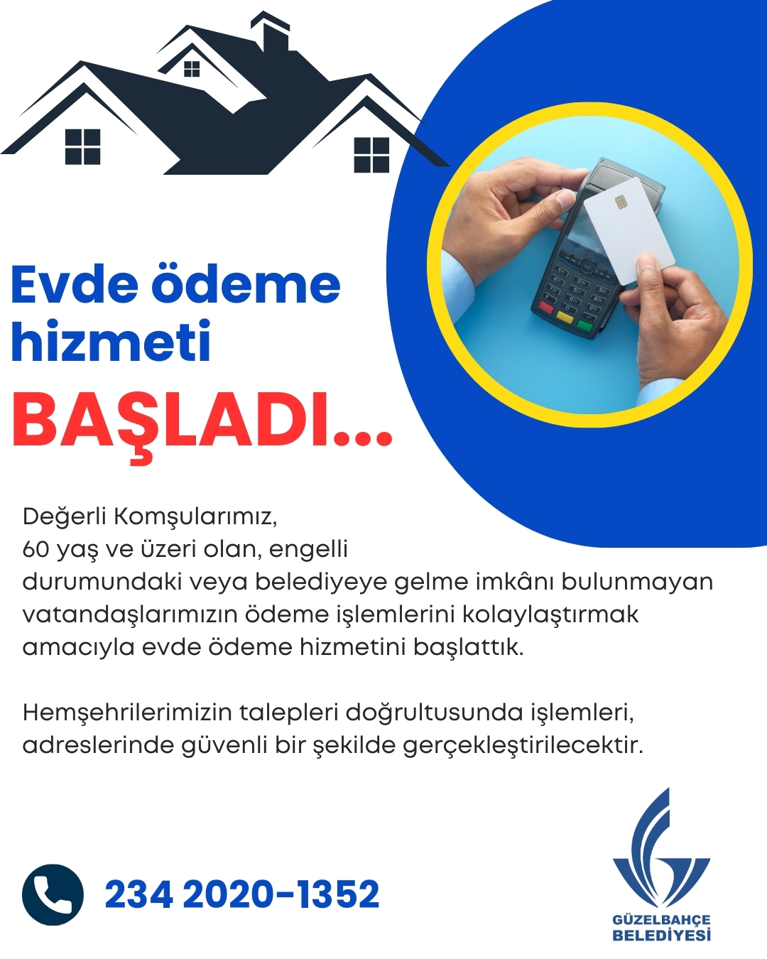 Güzelbahçe Belediyesi, 60 yaş ve üzeri olan, engelli durumundaki veya belediyeye gelme imkânı bulunmayan vatandaşların ödeme işlemlerini kolaylaştırmak amacıyla evde ödeme hizmetini başlattı.