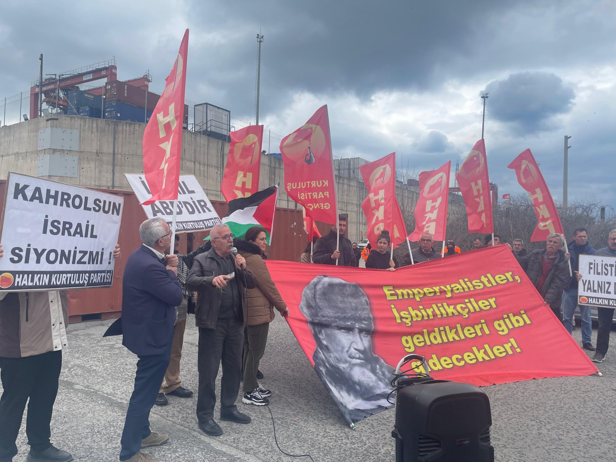 Halkın Kurtuluş Partisi; İsrail'e lojistik destek sağlamak için gelen MSC VEGA gemisinin Aliağa Nemport Limanına gelişini Nemport Limanında gerçekleştirdiği bir eylemle protesto etti.