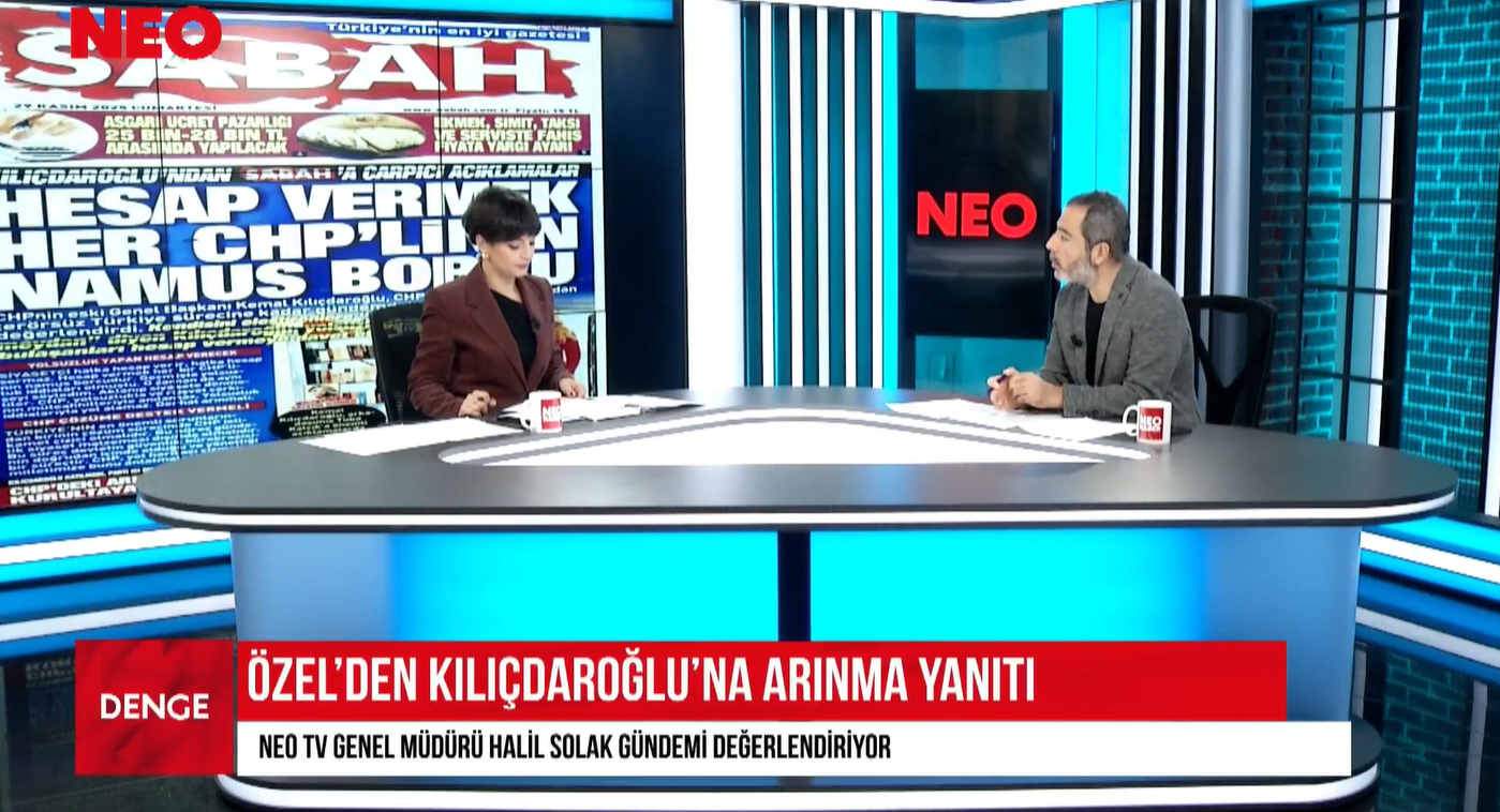 Gazeteci Halil Solak, NEO TV Denge Programı’nda CHP’nin 39. Kurultayı’nı tüm ayrıntılarıyla değerlendirdi. Bu kurultayın özeti: "Artık parti tabanı da değişimi tamamen kabullendiğini gösteriyor. Bu kurultaydan sonra partinin istikameti iktidardır" diyen Solak, Özel’in “...elinde kumandası üstünde pijaması olanlara...” çağrısını çarpıcı bir örnekle bağdaştırdı.
