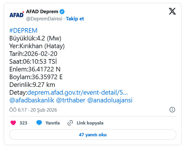 AFAD verilerine göre; Hatay'ın Kırıkhan ilçesinde saat 06.10 sularında 4.2 büyüklüğünde bir deprem meydana geldi. Sarsıntı, yerin 9,27 kilometre derinliğinde meydana geldi.
