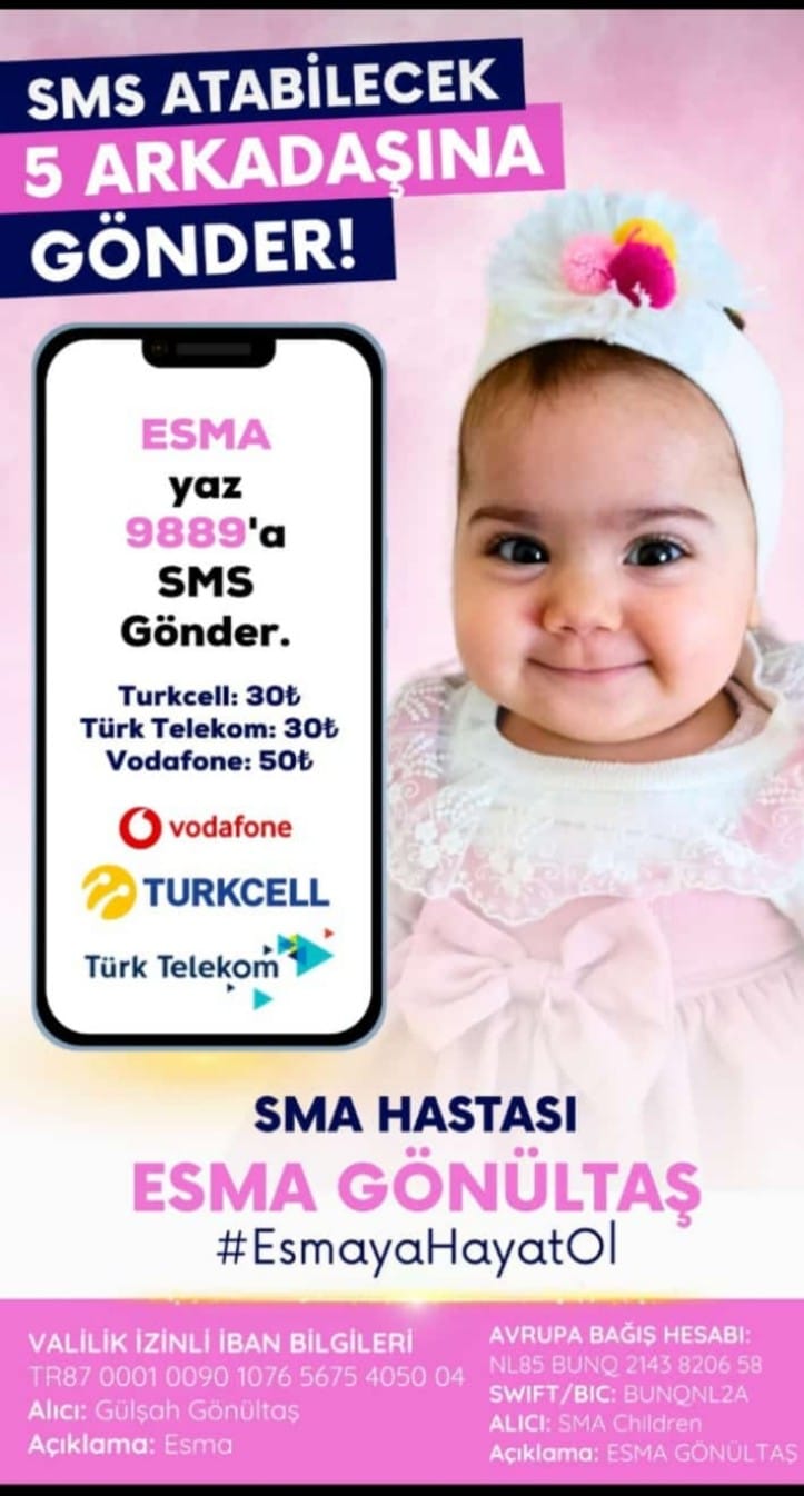 Bornova ilçesinde oturan Halil Gönültaş-Gülşah Gönültaş çiftinin üç sağlıklı çocuğunun ardından 17 Temmuz 2024'te dünyaya gelen kızları Esma Gönültaş'a, 7 günlükken topuğundan alınan kanla SMA Tip 1 teşhisi konuldu. Haftanın 3 günü fizik tedavi desteği alan Esma'nın gen tedavisinden faydalanabilmesi için açılan bağış kampanyası yüzde 90 seviyesine ulaştı. Gülşah Gönültaş "Doğduktan 7 gün sonra topuk kanından SMA Tip 1 olduğunu öğrendik. İlk başlarda inanmadık. Çünkü 3 sağlıklı evladım var. Bu hastalık çok sinsi. Yarın ne olacağını bilmiyoruz. 1 aylıkken Spinraza ilacına başladık. 5 doz uygulandı. Bir kampanyamız var. Yüzde 90 seviyesine ulaştık. Ama artık çevremiz de tükendi. Sizlerden yardım istiyoruz. Kızımın elinden tutun ki ilacına, sağlığına kavuşsun" dedi.