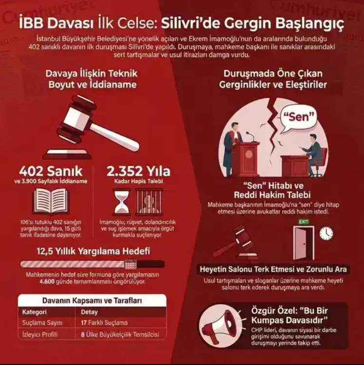 İstanbul Büyükşehir Belediyesi'ne (İBB) yönelik mali soruşturma kapsamında hazırlanan 3 bin 900 sayfalık iddianameyle açılan ve aralarında seçilmiş İBB Başkanı ve CHP’nin cumhurbaşkanı adayı Ekrem İmamoğlu’nun da bulunduğu 107’si tutuklu 402 sanıklı davanın üçüncü celsesi bugün Silivri’deki Marmara Kapalı Cezaevi Duruşma Salonu’nda görülüyor.