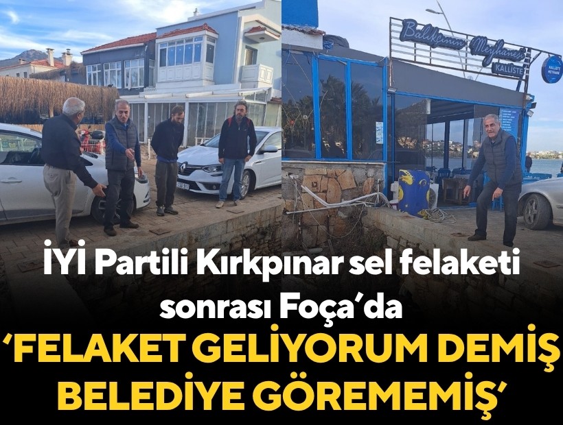 İYİ Parti İzmir Milletvekili Hüsmen Kırkpınar Foça’da yaşanan sel felaketinin ardından ilçeye giderek incelemelerde bulundu. Kırkpınar belediyeyi hedef alarak, “Felaket geliyorum demiş, göremeyen Foça Belediyesi olmuş…” dedi.