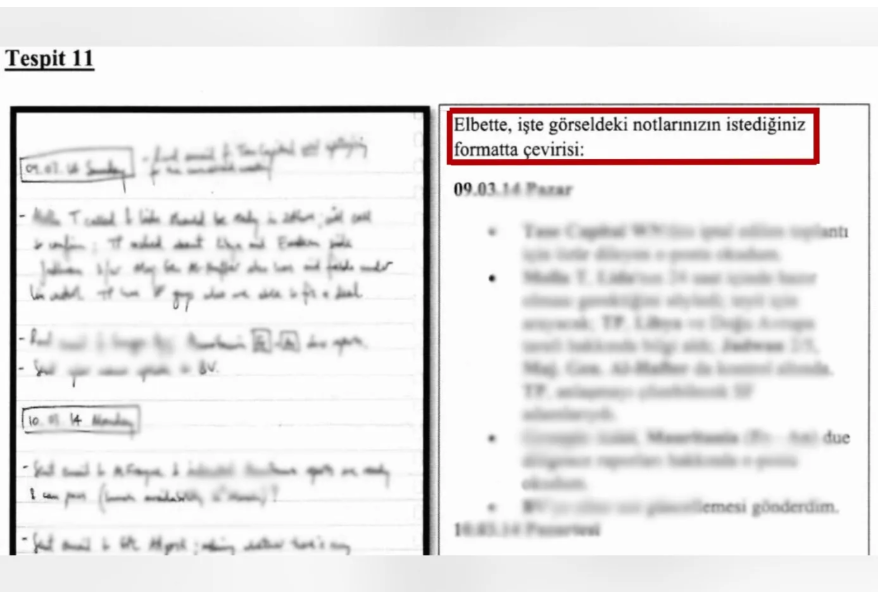 SoL Haber’den Yiğit Günay’ın haberine göre, iddianamenin 37’inci sayfasında yer alan çevirinin başında “Elbette, işte görseldeki notlarınızın istediğiniz formatta çevirisi” ibaresi yer alıyor.