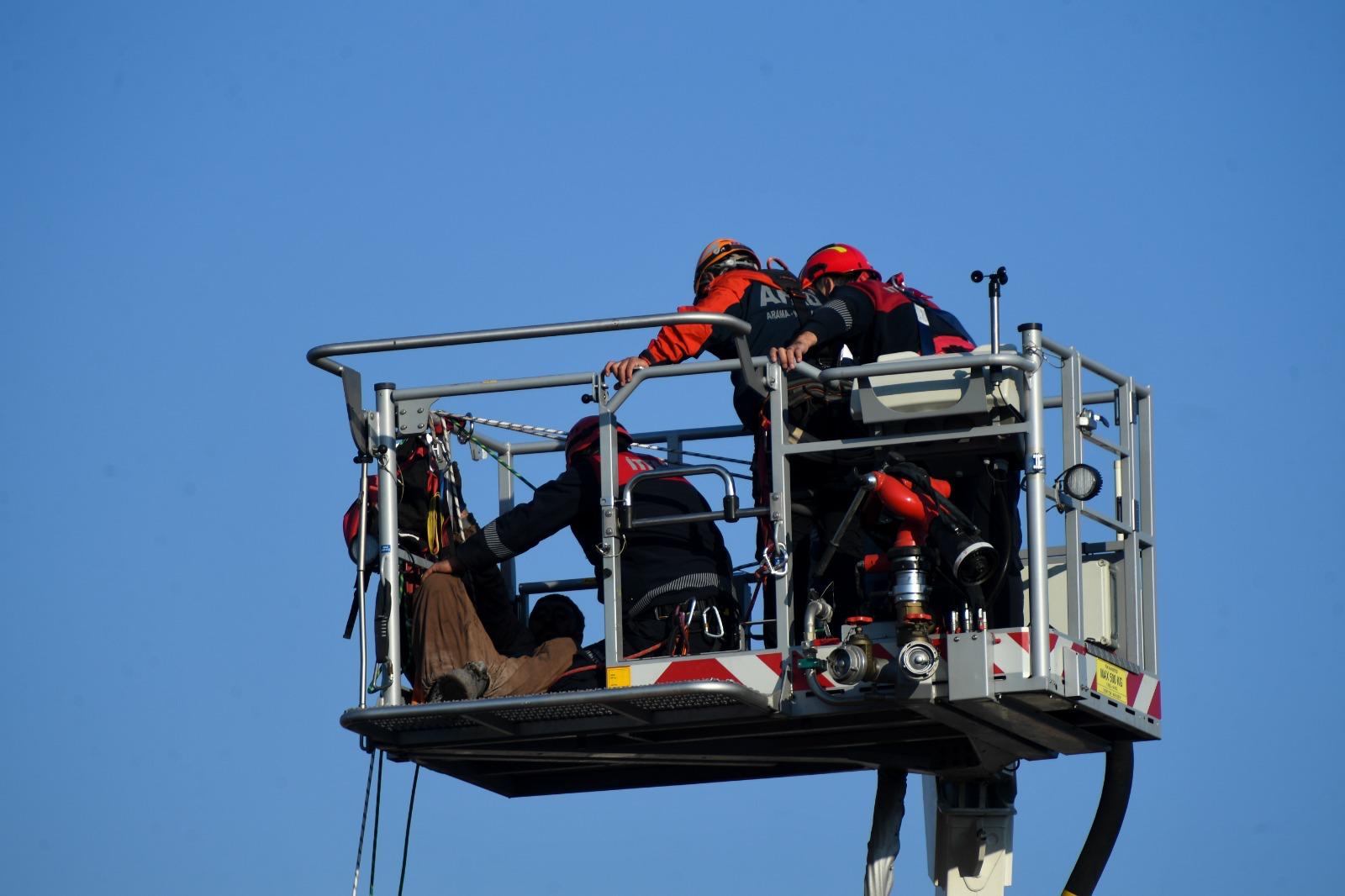 Ekipler, 90 metrelik merdivenli araçla bacanın üst kısımlarına doğru çıkarak işçilere ulaştı.