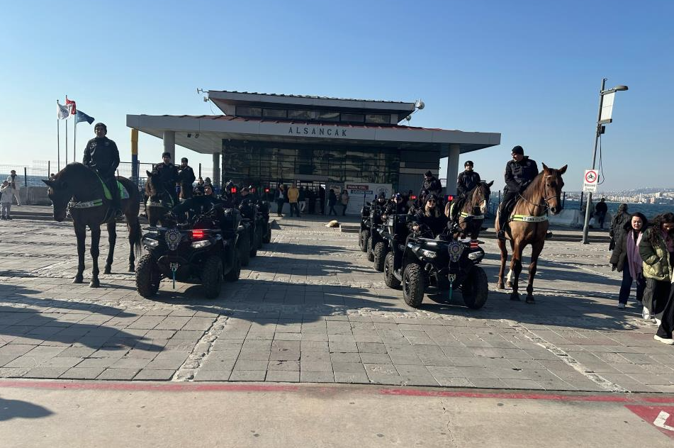 Özellikle; Gündoğdu Meydanı, Alsancak İskele, Cumhuriyet Meydanı ve Güzelyalı bölgesindeki sahil boyunca 6 atlı polis birlikleri ve 10 ATV’li polis timleri, özel tedbirler çerçevesinde bölgede görev alıyor.