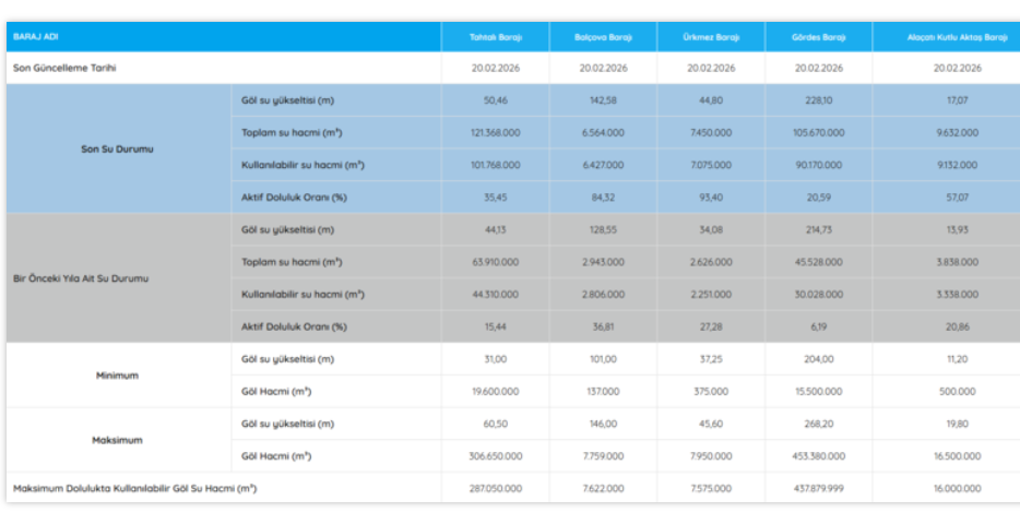 İzmir’de içme suyu sağlayan barajların 20 Şubat 2026 tarihli doluluk oranları belli oldu. Kentin en önemli içme suyu kaynağı olan Tahtalı Barajı’nda aktif doluluk oranı yüzde 35,45 olarak ölçüldü.